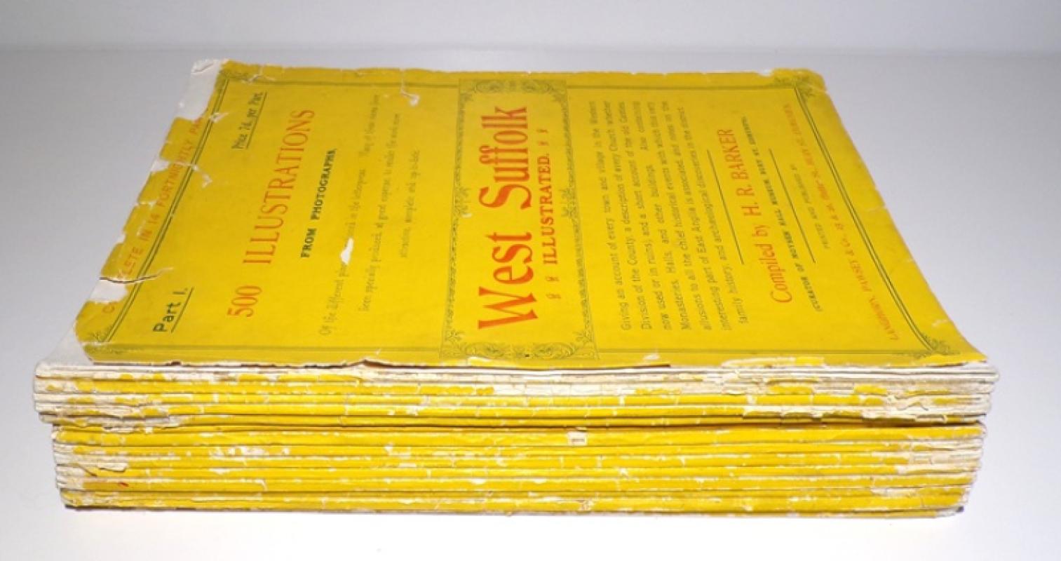 Published in 1907, this is the first edition of this illustrated work taking the villages and towns of West Suffolk, this copy being in its original fourteen fortnightly parts. 11 inches tall approx., 411 pages across the 14 parts, with 500 illustrations from Photographs