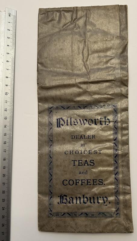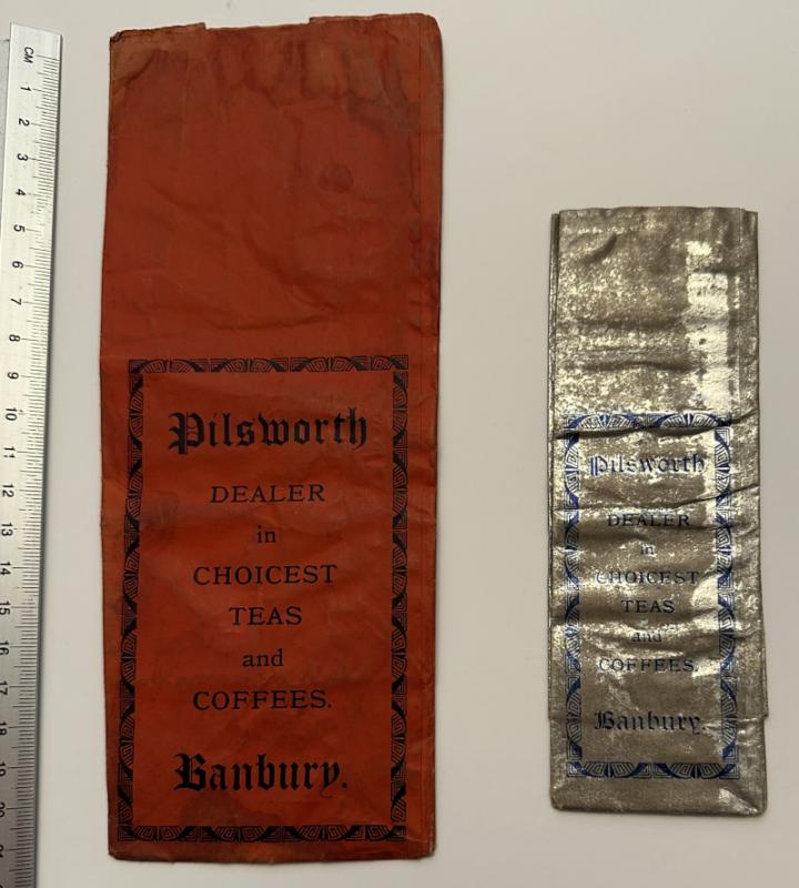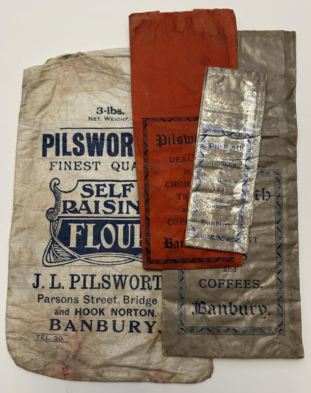 3 paper bags of varying sizes from Pilsworth dealer in choicest teas and coffees, Banbury. The red bag is very stained. The metallic coated bag is very worn. All very creased. Together with a very stained cloth self raising flour bag from J.L Pilsworth of Parsons Street + Bridge Street, Banbury and Hook Norton, this bag is very heavily stained. Unusual survivors. Undated, circa 1910??