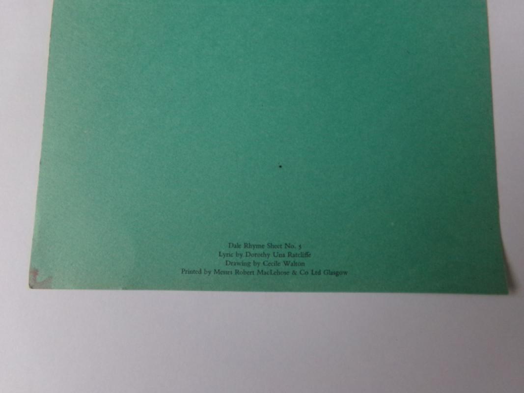 RATCLIFFE, Dorothy Una. Cream card with poem titled 'A Blessing: for Fiona Margaret' pasted to green framing card, with ribbon for hanging. No place: Privately Published, early 1950s. With two original illustrations by Cecile Walton. Dale Rhyme Sheet No. 5. Printed by Messrs Robert MacLehose & Co Ltd Glasgow. Fine copy, as issued.