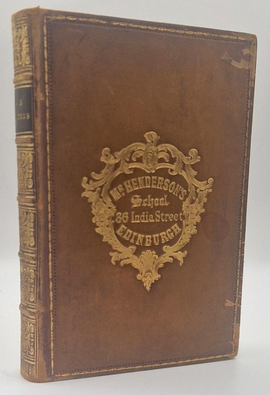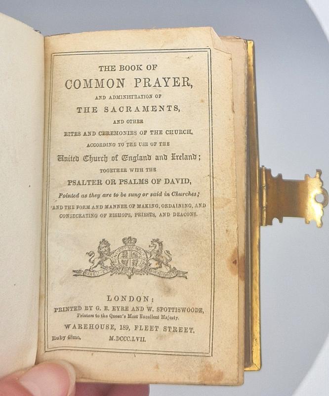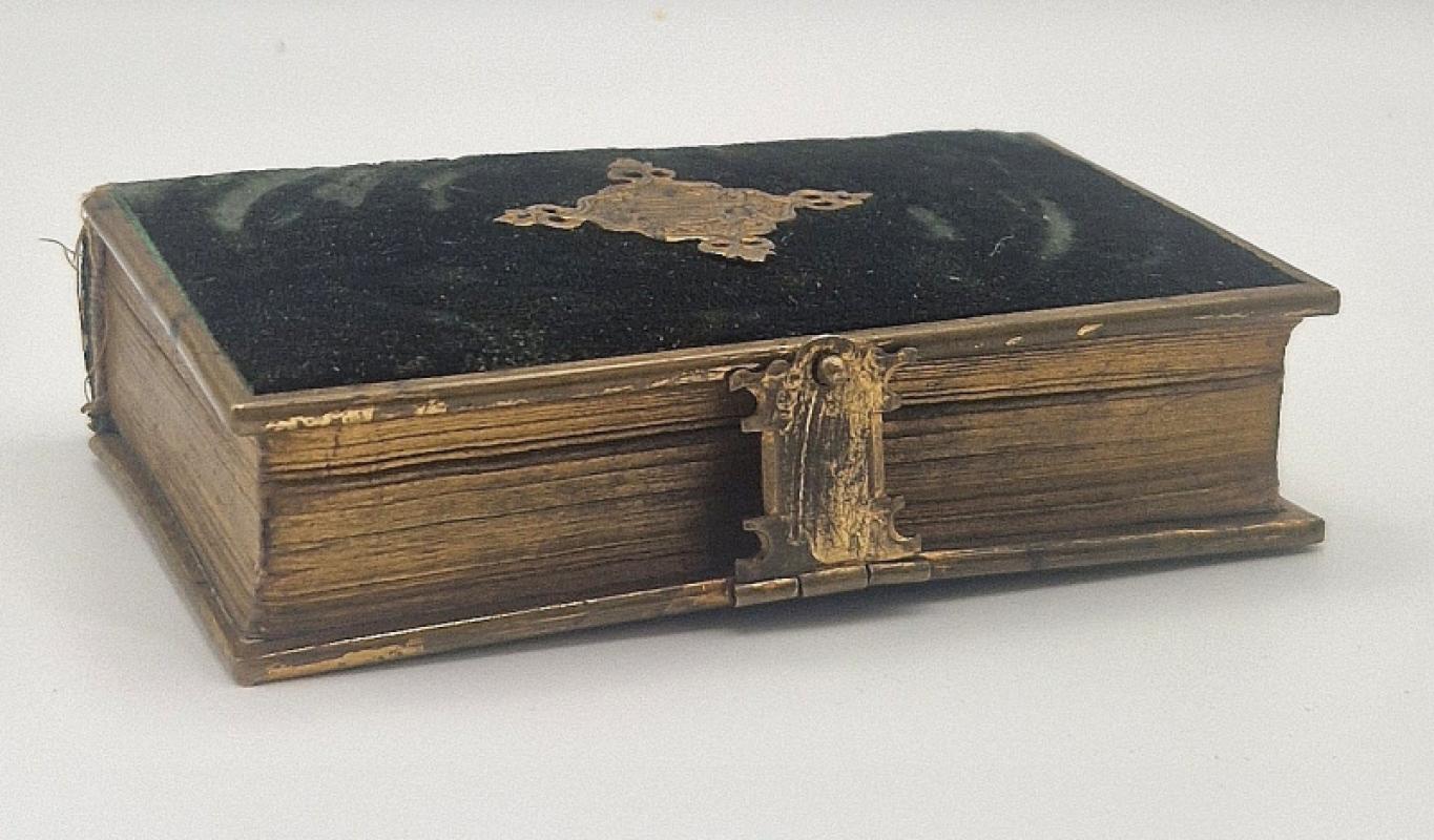 Dark green velvet boards with brass decoration to the front. Gilt page edges, brass board edges and a brass working clasp. Tanning tot he pages. Fraying to the tail of the spine and what appears to be ring marks to the front. No inscriptions , clean pages throughout. (Any digital image available on request).