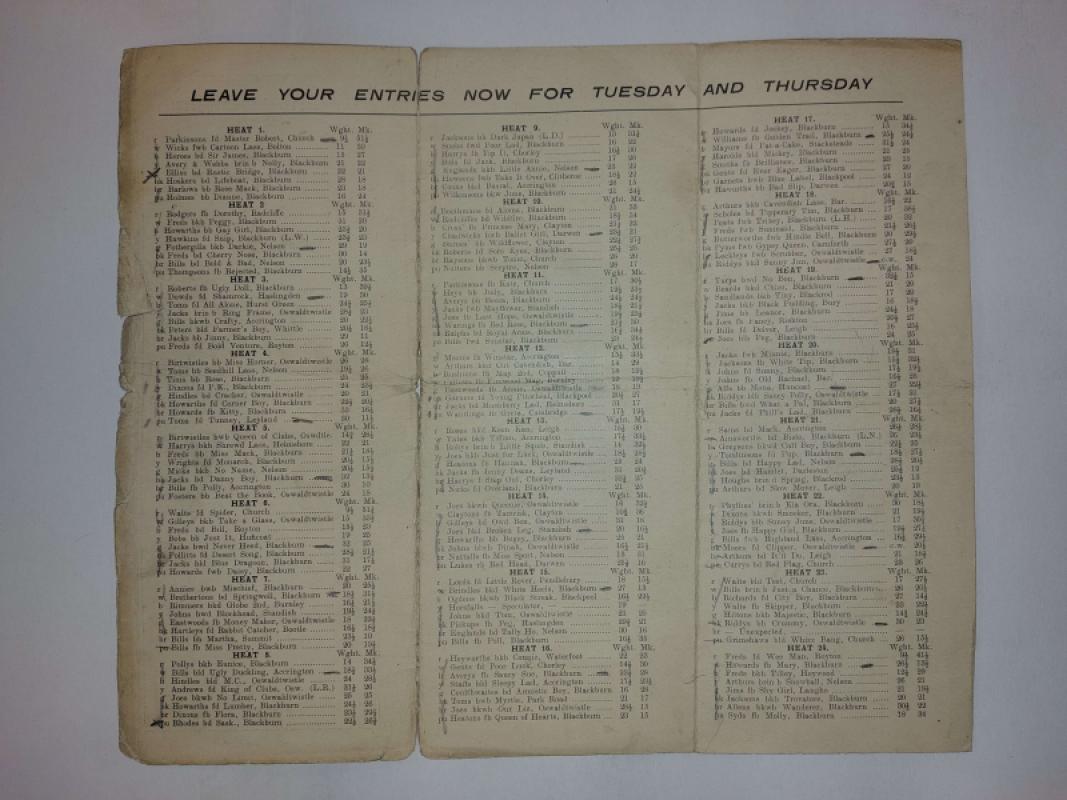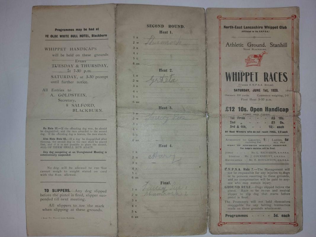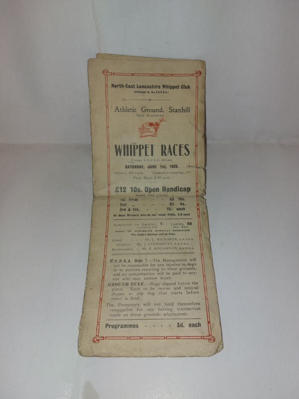 Published for the North-East Lancashire Whippet Racing Club racing at Stanhill, Blackburn between 1928-9 comprising trifold card 23.5 x 24cm printed in black and red with details of races &c. 'Programmes may be had at Ye Old White Bull Hotel, Blackburn' pencil annotations, some soiling, creasing and edge tears