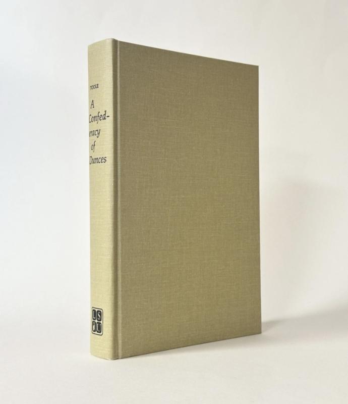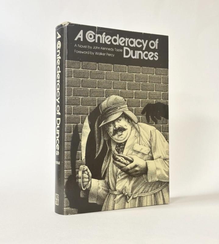 TOOLE, John Kennedy. A Confederacy of Dunces, together with RODRIGUE, George, “Robert Coles Searches for Grace Among the Dunces”, framed poster with inscription from the author’s mother. Baton Rouge and London: Louisiana State Press. 1980. 8vo. First edition, first printing. Publisher’s grey cloth lettered in black to the spine, in the striking dust jacket designed by Ed Lindlof giving us a first taste of Toole’s marvellous invention, Ignatius J. Reilly. The poster designed by advertising the Memorial Lecture of John Kennedy Toole on Friday Sept. 18, 1981 at the University of Southwestern Louisiana campus, measuring 80cm x 47cm in the frame, behind glass, the poster with inscription, “Sincere appreciation from John Kennedy Toole’s mother, Thelma Ducoing Toole” in ink. The book fine, the boards pristine, the binding tight and square, the contents fine throughout with a little offsetting to half-title only. Pencil inscription to green front endpaper which nicely places the book purchased in Louisiana at the time of publication. The dust jacket the first state and issue with Walker Percy’s blurb to rear panel and the faint spots to all panels as called for. Unclipped ($12.95) and complete with a small handful of tiny nicks and closed tears. Highly presentable. The poster presenting fine, the frame with two small nicks and one slight split to lower panel.