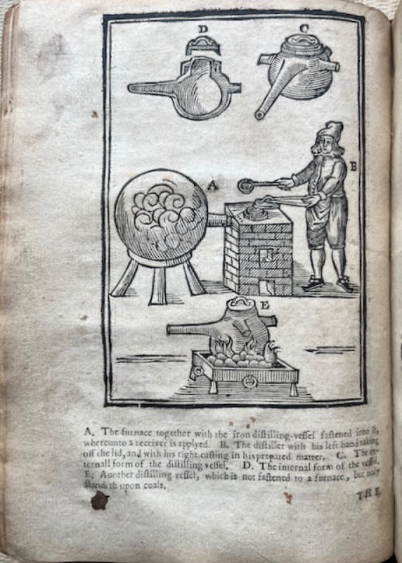 Small 4to, A-Z, Aa-Zz, Aaa-Ooo4, five parts in one volume, each with a separate title-page, separate t-ps also to “Tincture of Gold” and “Mineral Work” dated 1652, 3 full-page woodcut illustrations of chemical apparatus and furnaces and 13 woodcuts in the text, Qq1 blank is present, mended tear in margin of Gg4, mild browning throughout, old half calf over marbled boards, worn, stoutly rebacked. Armorial bookplate of “Harold Marshall” on front pastedown, and that of “Dr & Mrs H.R.Kohl” on front fly.