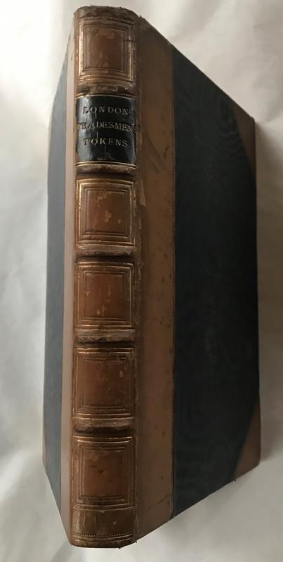 Printed for use of the Members of the Corporation of the City of London, 1855, 2nd edition. Half leather binding, raised bands to spine, the words "London Tradesmen's Tokens" printed on a black leather patch. 8.75ins x 5.75ins, xcv, 287pp plus frontis & 3 plates. ( Illustrations depict Henry Beaufoy, Gerards Hall Crypt, The Devil Tavern in Fleet Street & a portrait of Richard Whitington, Lord Mayor). The main text lists issuers of tokens by area and provides a description of the tokens issued. A scholarly and comprehensive work . Binding a little rubbed, internally VG.