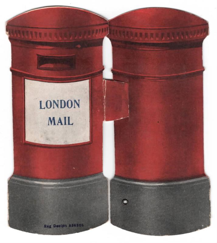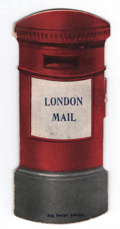 A die-cut book in the form of a British post box, captioned to front 'London Mail'.