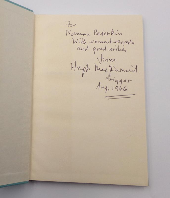 MACDIARMID, Hugh. A Drunk Man Looks at the Thistle. Np [Edinburgh]: The 200 Burns Club 1962. Fourth Edition. Inscribed by the author: ‘For/ Norman Peterkin/ with warmest regards/ and good wishes/ from/ Hugh MacDiarmid/ Biggar/ Aug. 1966’. Fine copy in Near Fine dj.