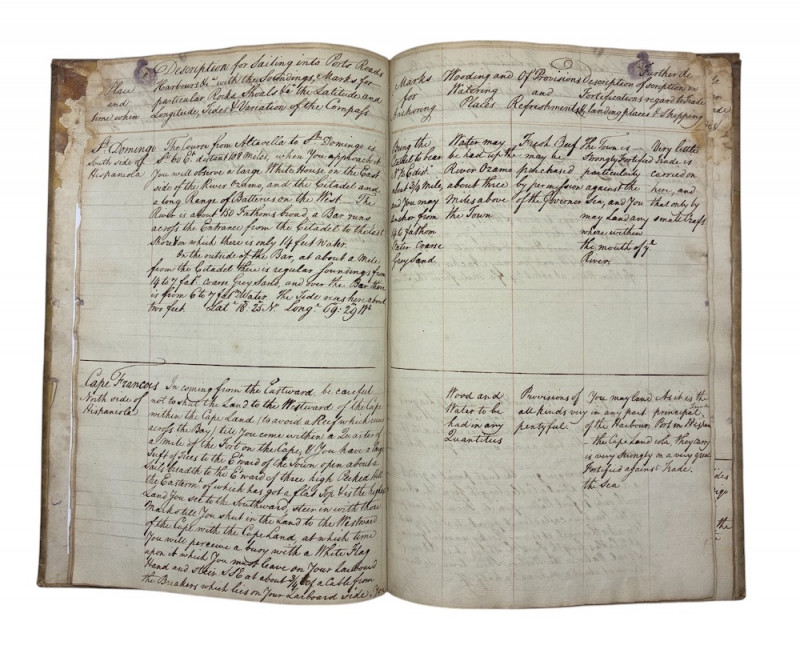Perhaps the most interesting volume of this collection is that which provides detailed sailing instructions for the various Ports, Roads and Harbours of the Jamaica Station, with - apart from nautical necessities - comments on the degree of fortification, the type of provisions available and the availability of fresh water. The first 11 leaves of this volume - providing such details for: Port Royal; Altavella; St. Domingo and Cape Francois in Hispaniola; Cumberland Harbour, Cuba, Aruba; 'Curracoe & Harbour of Schotte Gat'; Bonnair, and Alvis - is in a distinctly different hand. Gage takes up the volume from there, adding remarks in the same categories from December 1786 for the 'Turks Islands', 'Bonaua', 'Tuxillo Bay', The Bay of Honduras, 'Cape Gracias-a-dio' and the 'Great Cayaman Islands'.