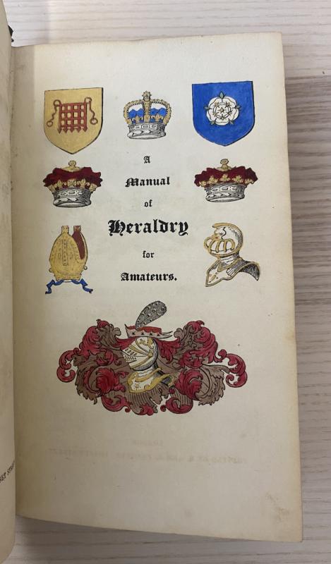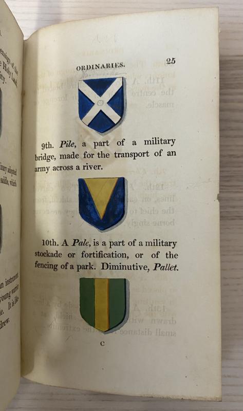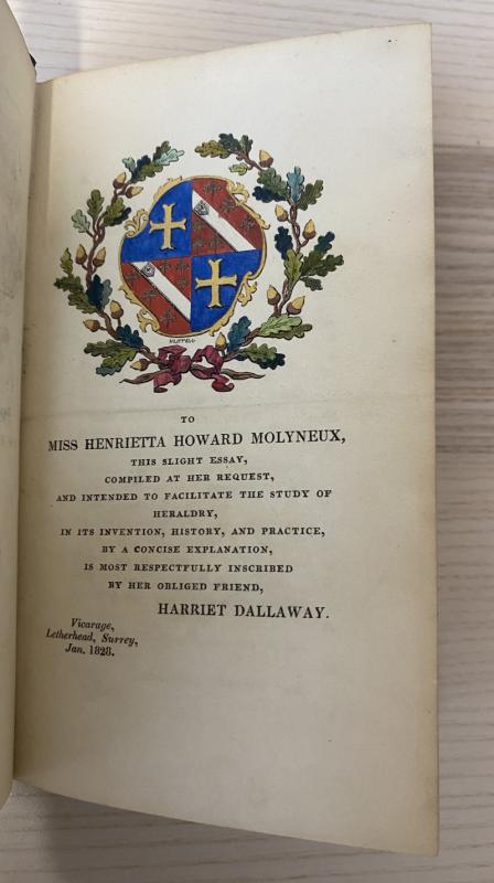 Full contemporary cloth, appearing to lack original spine label. Head and tail of the spine bumped resulting in losses, and some chipping to the joints. Extremities bumped, spine a touch cocked. Front pastedown with adhesive residue from removal of a bookplate, later ownership inscription to ffep, which has a tear of 1" towards gutter. Hinges a touch strained, else binding remaining tight. Leaves bright and clean. Illustrated by Harriet Dalloway with black and white vignettes throughout, and including a coloured half title & dedicatory page. A scarce early 19th century work on heraldry.