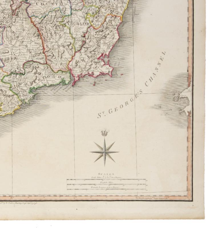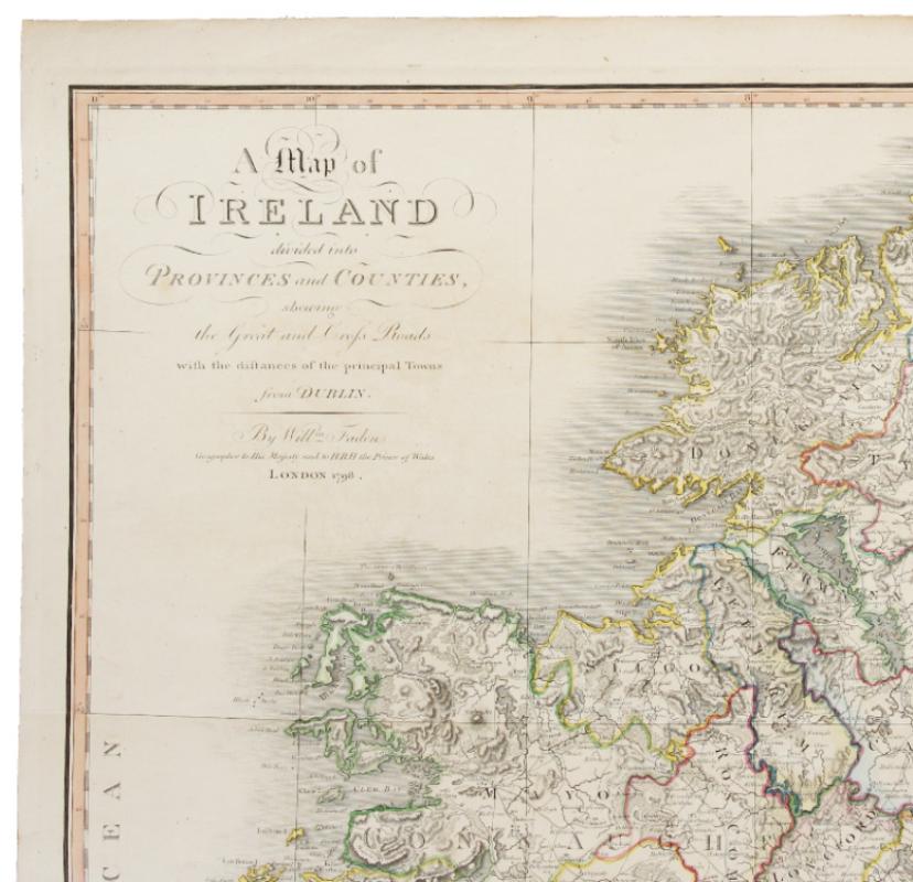 Engraved map by and after Faden on laid paper watermarked ‘JBATES’, hand-coloured in outline (platemark: 715 x 555mm; sheet: 755 x 572), folded vertically for binding, traces of guard on verso. Annotated and numbered on the verso ‘Irelande 7’ in a contemporary hand. (Very light offsetting, slightly creased, short marginal tear, small candle-wax mark.) A very good example with contemporary hand colouring.