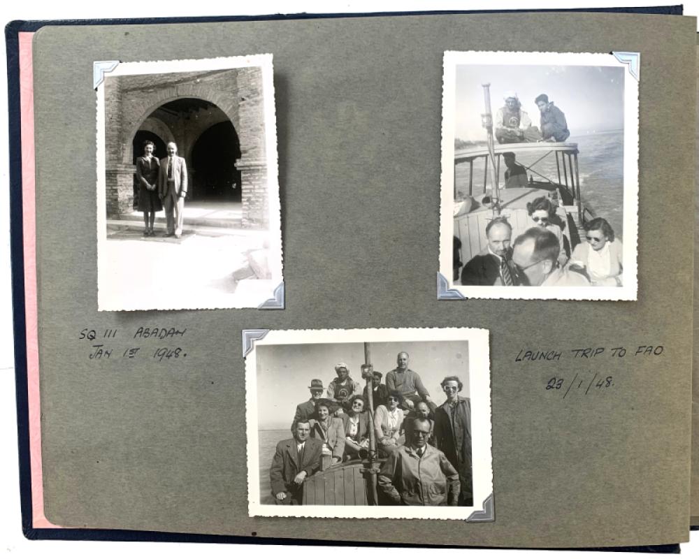 These photographs document the life of a couple in the United Kingdom - on holiday at Ullapool (5 images, June 1947), visiting parents in East Kilbride (10 images, July-August 1947), and at home in Northolt, Middlesex (8 images, August-October 1947), before they head to Iran. Most of the images show them at home in staff quarters in Abadan (22 images January 1948 and April 1949), though six photographs record their “Launch Trip to Fao 23/1/48”, the images showing them aboard a small boat. Six photographs were taken on a Persian Gulf “Cruise on “Dumra” March 1949 Abadan, Kuweit, Bahrein, Karachi, Bombay & back” - including an image of “The Quoins”.
