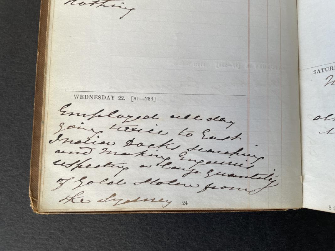 22nd March Employed all day going to East India Docks searching and making enquiries respecting a large quantity of gold stolen from the Sydney.