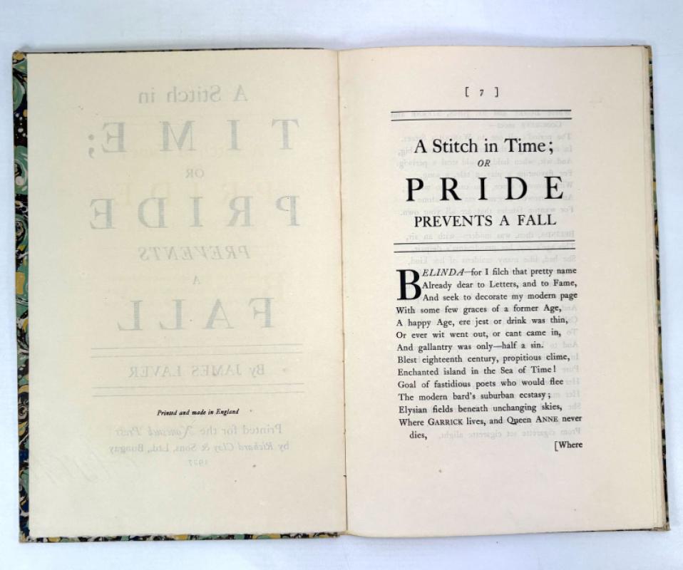 A finely produced limited edition from the Nonesuch Press, A Stitch in Time; or Pride Prevents a Fall by James Laver reflects the Press’s characteristic blend of typographic elegance and understated craftsmanship. Issued in 1927 in a numbered edition of 1525 copies for sale in England and America, the work presents a light, satirical poem in a style consciously echoing eighteenth-century verse, a period in which Laver had a well-known scholarly interest.
