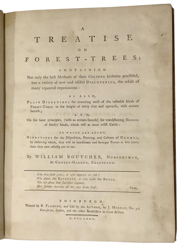 BOUTCHER, WILLIAM. A Treatise on Forest-Trees: containing not only the best methods of their culture hitherto practised, but a variety of new and useful discoveries...plain directions for removing most of the valuable kinds of forest-trees...and on the same principles, (with as certain success) for transplanting hedges...to which are added, directions for the disposition, planting and culture of hedges. [4], xlviii, 259, [4]pp., with the printed title, but bound without the engraved half-title-page as is often the case. Contemporary tree calf, neatly rebacked retaining the original red morocco label. Some wear to the corners and slight foxing.