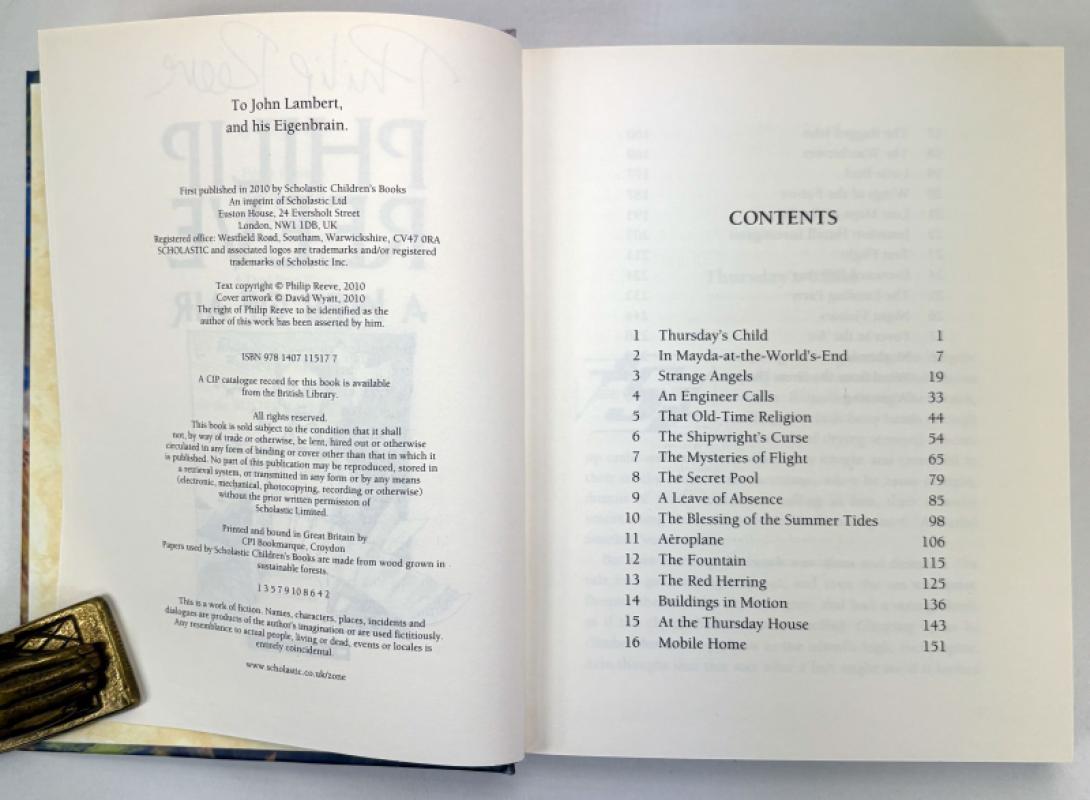 Published by Scholastic, London, 2010. First edition, first impression - signed by the author, and additionally illustrated with an original pen drawing by Philip Reeve on the title page (remarque).