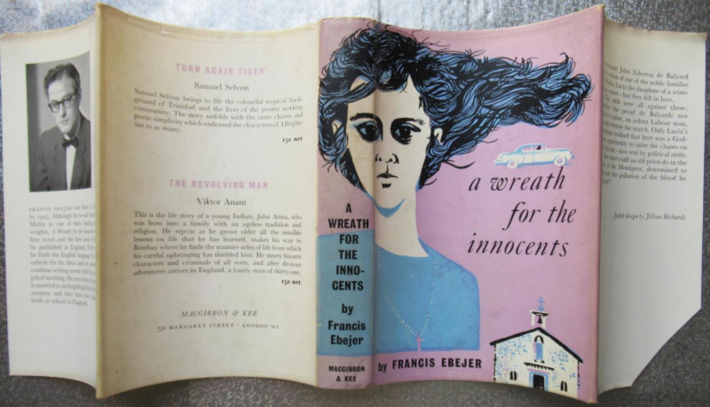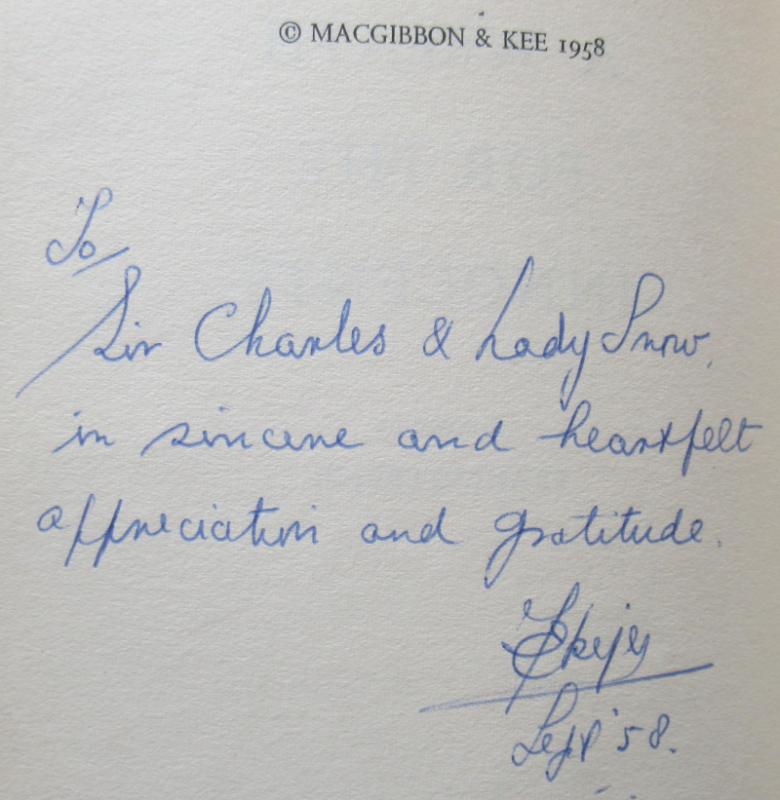 First edition. 255 pages. Inscribed by the author to the copyright page: “To Sir Charles & Lady Snow, in sincere and heartfelt appreciation and gratitude. F. Ebejer Sept ‘58”. The recipients were fellow writers, C. P. Snow (1905-1980) and Pamela Hansford Johnson (1912-1981). The book is firmly bound in slightly rubbed and bumped black cloth, lettered in gilt to the spine. The text block is slightly marked and age toned, with some lightly creased corners, to the front endpaper is the ownership blind-stamp of a David Hopkinson. The dust jacket, with the striking illustration by Jillian Richards, is the original, it is price clipped, slightly toned, marked, rubbed and creased, with a few minor nicks and short closed tears to the edges. Already well known as a playwright, this was the Maltese author’s first published novel, a love story set in Malta against the backdrop of post-war social and political strife. The first edition is rare and this is an excellent literary association copy.
