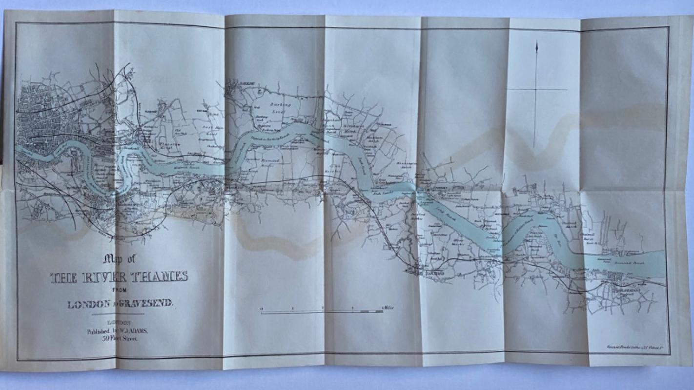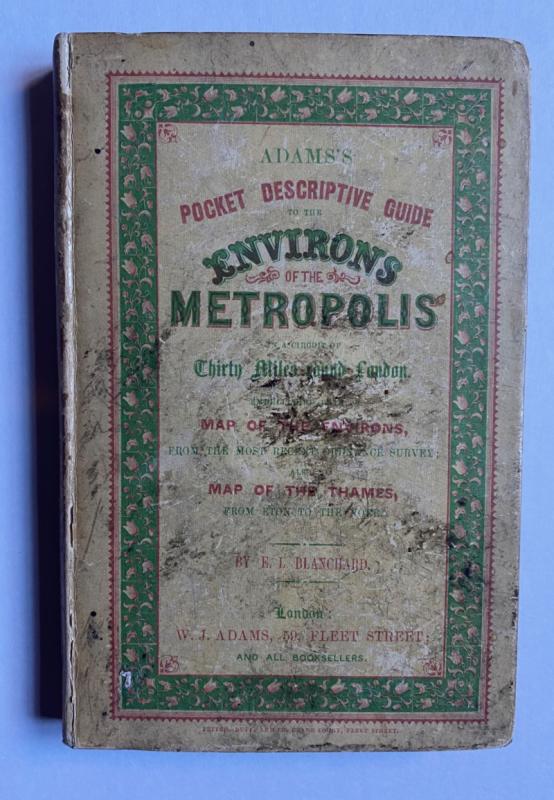 Adams's Pocket Descriptive Guide to the Environs of the Metropolis; embracing Berkshire Hertfordshire Middlesex Surrey Kent and Essex in a circuit of Thirty Miles round London embellished with a map of the environs from the most recent Ordnance Survey: also a splendid Map of the Thames by E L Blanchard published by Adams London circa 1850. In stiff decorated boards size 17 by 11 cm. 168 pages. With bookplate to front endpaper. Some signs of handling to a rather dull front cover and a closed tear to one map but Good to VG condition overall.