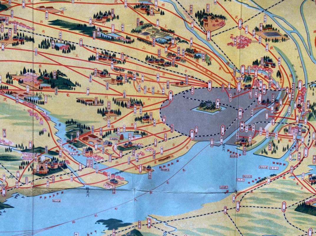 A map of Tokyo and its Environs by Toshiyoshi Inagaki, published by Kudan Shubo, Tokyo 1928. On paper size 79 by 55 cm. Colour. The map is in the form of an aerial view with Tokyo Bay in the foreground, Mount Fuji to the left, Chiba to the right and distant mountains beyond. A mixture of reality and imagination, the map is more of a stylised image rather than an attempt at geographical accuracy. Text and photographs to the reverse. Folds into a small decorated paper wallet type cover with publisher’s details etc. Occasional closed edge nicks and one small area of sky with image loss, otherwise good condition. Has been folded.