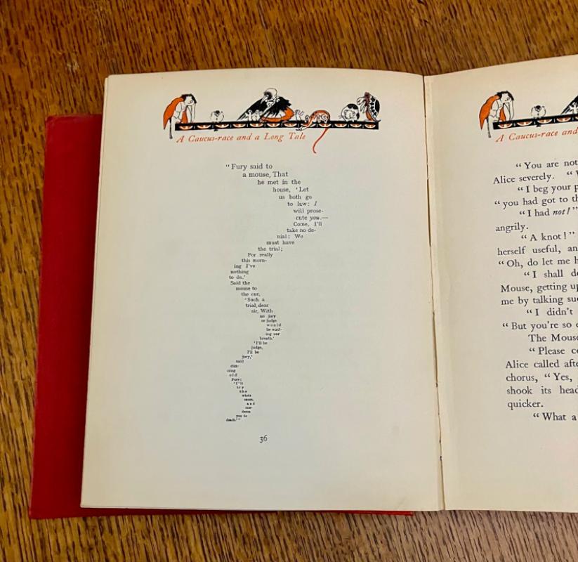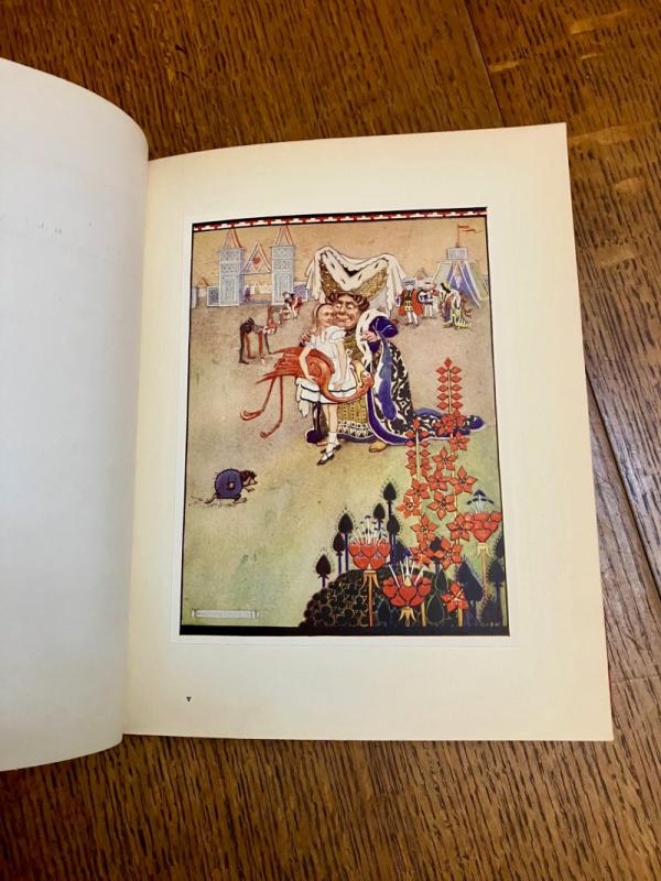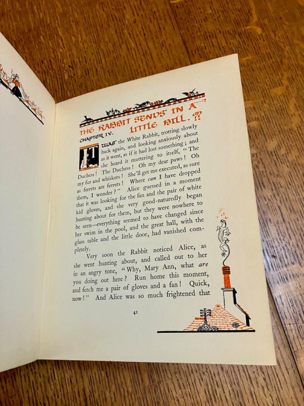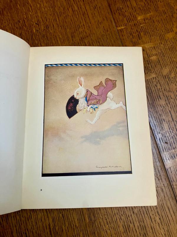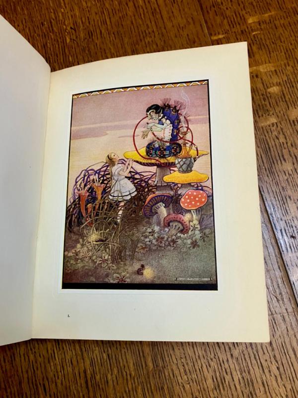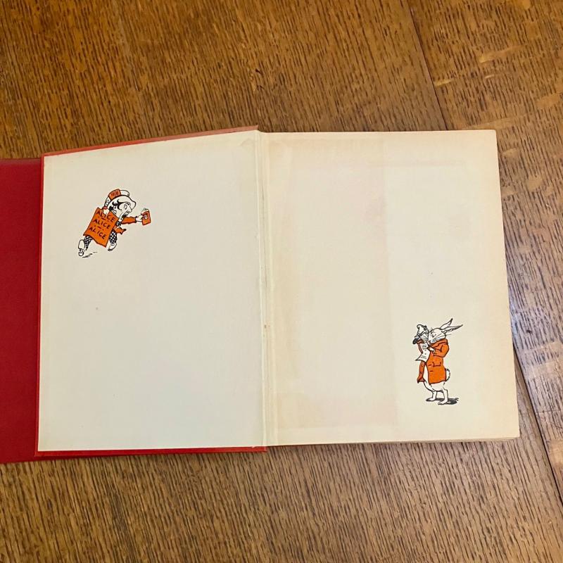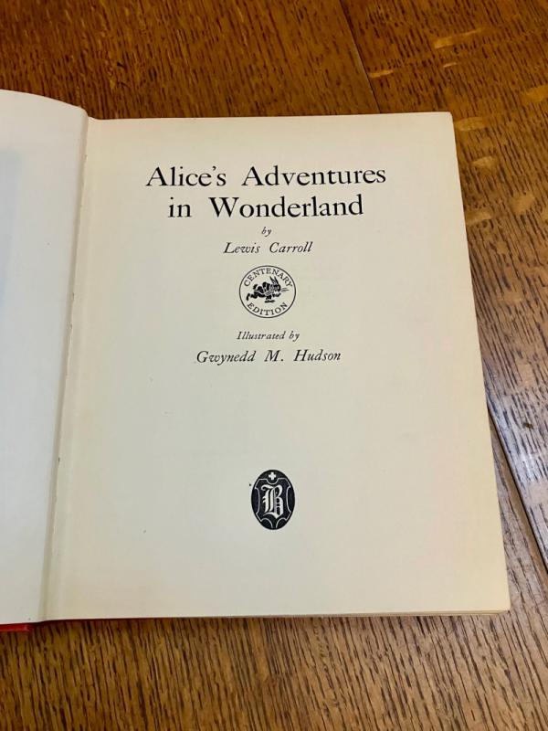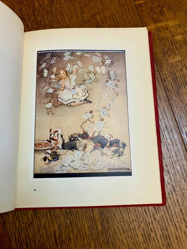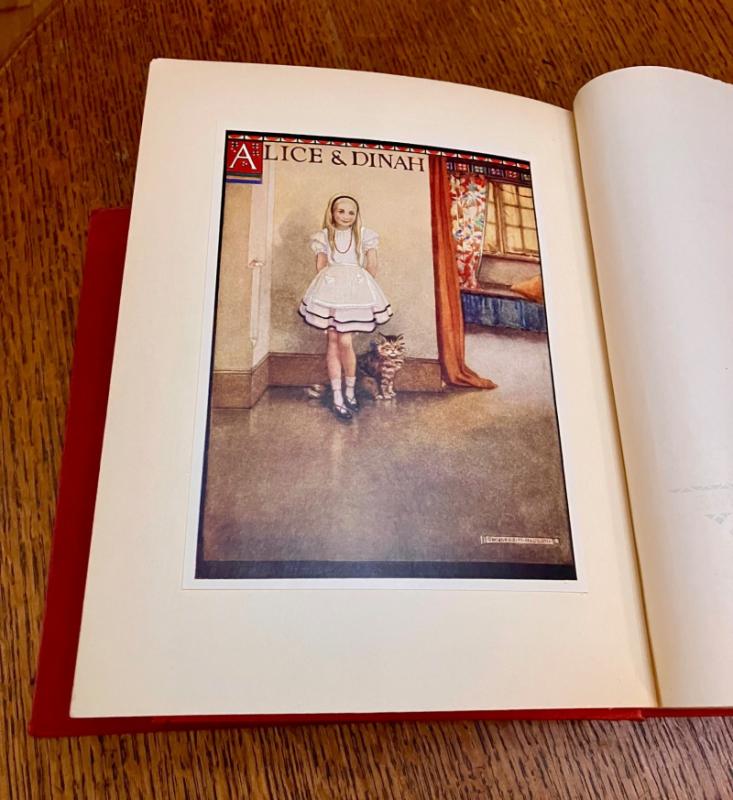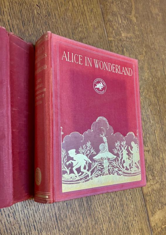 CENTENARY EDITION. 4to. (10.1 x 8.1 inches). Finely illustrated with 12 mounted full colour plates, each with a printed tissue guard, and dozens of line drawings throughout the text and along top of text pages. A small amount of offsetting to the endpapers and a neat owner name in the printed panel for ownership details, but generally a lovely clean and bright copy in the original publishers red cloth binding with gilt ruled lines and lettering to the spine. Front board with gilt lettering and gilt and pink illustration within four white ruled border lines. Cloth is a bit faded but the gilt still bright and fresh. In the original dustwrapper with black lettering to spine. Rear panel illustrated in black with the March hare and Mad Hatter. Front board lettered in black and with a full colour plate mounted onto the centre, all within a four line ruled black border. Some minor fading to the dustwrapper spine. A couple of small chips to the top and bottom of the spine and a few small closed tears, without loss to the edges. Overall a very good book in a very good dustwrapper. ----- This beautifully illustrated edition was originally issued in 1922 and re-issued in this edition to mark the centenary of Lewis Carroll's birth.
