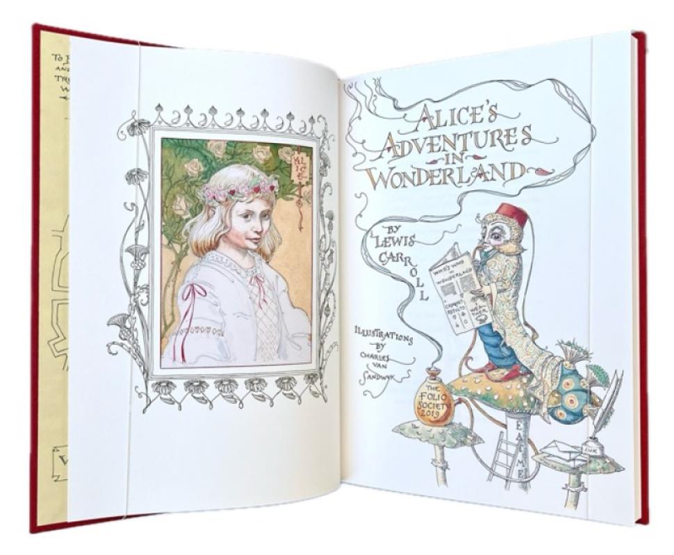 Large 8vo.; original red cloth lettered gilt to spine with triple-line gilt panel to upper cover, with onlaid plate by van Sandwyk featuring the White Rabbit surrounded by a sinuous and intricate thistle and flower border in black and gilt, pictorial endpapers in cream and green, housed in the original decorated green slipcase; pp. [xiv], [3]-148 + [i]; with pretty pictorial title-page in colours, frontispiece, text decorations in line, and a profusion of illustrations throughout by van Sandwyk, largely in colour, appearing as double, and full-page, plates, vignettes, or “scraps”, together with smaller illustrations, pictorial initials and line illustrations; a fine copy in a similarly fine slipcase.