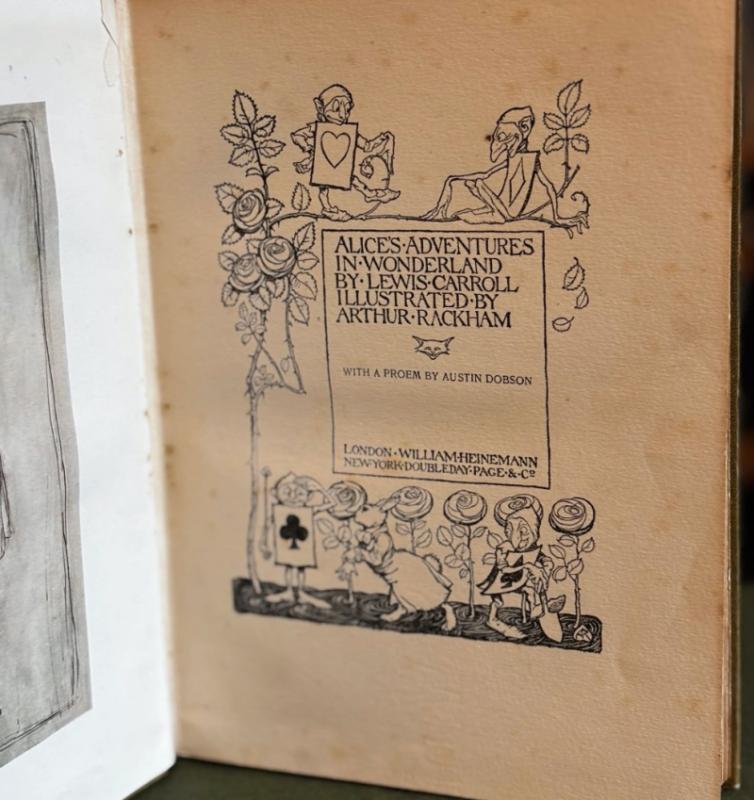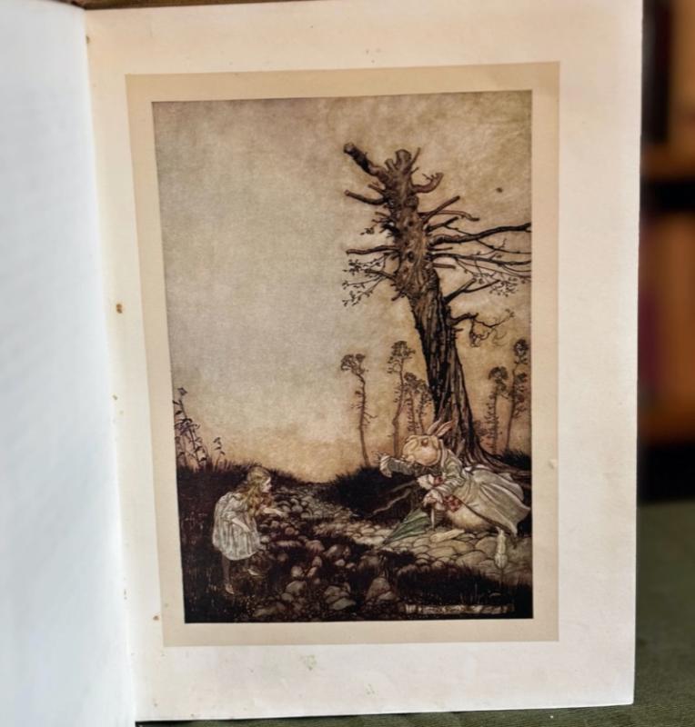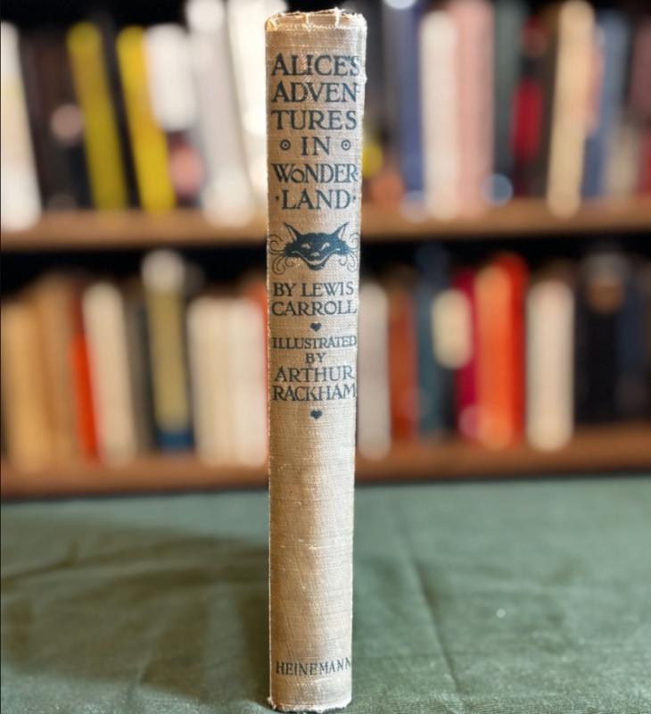 This 1907 edition of Alice's Adventures in Wonderland, notable as the first edition featuring Arthur Rackham's exquisite illustrations, which have become iconic of Lewis Carroll's classic work. The colour plates in this edition are thoughtfully integrated throughout the text, enhancing the narrative flow of the work. The olive-green cloth binding with gilt and dark blue detailing is both elegant and distinctive. Rackham's imaginative artistry, combined with the high production quality of this edition, makes it a landmark in the history of illustrated books. A complete and well-preserved example of this celebrated collaboration between author and illustrator.