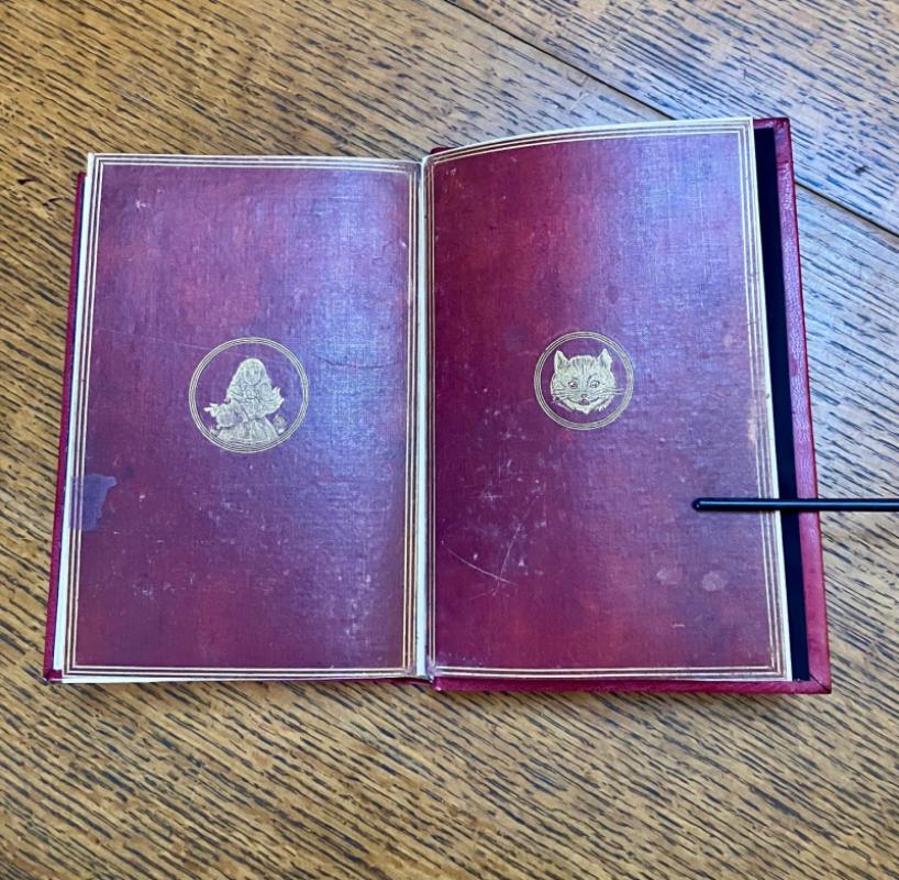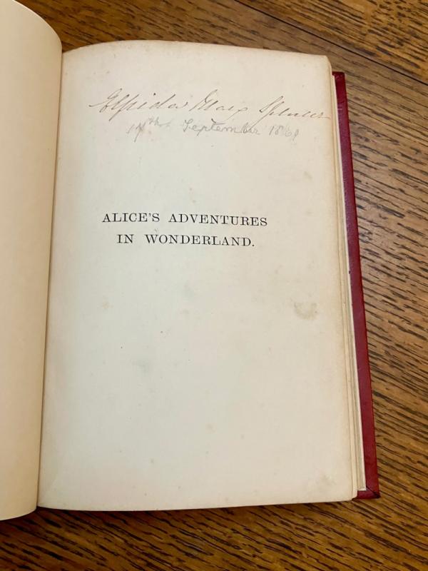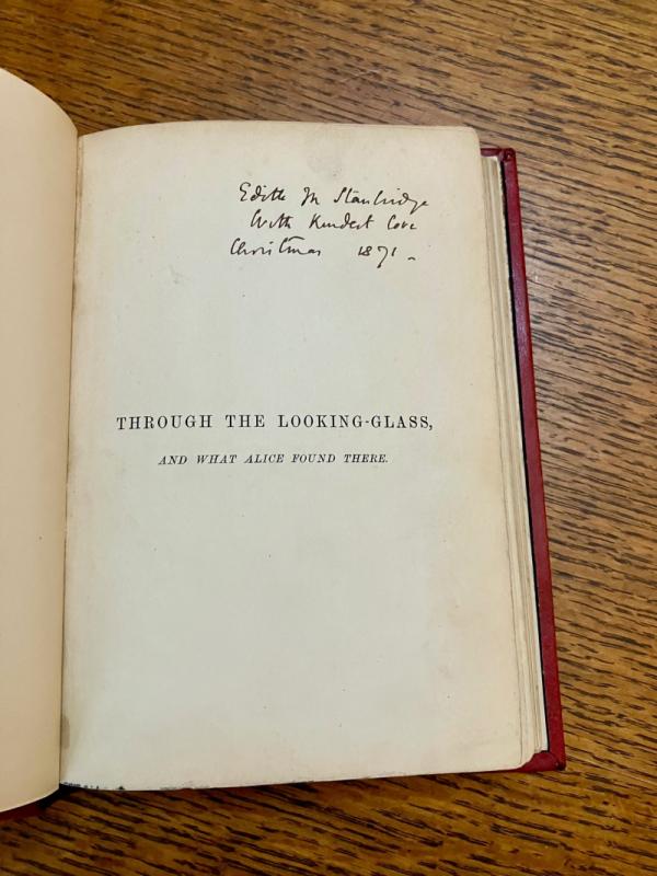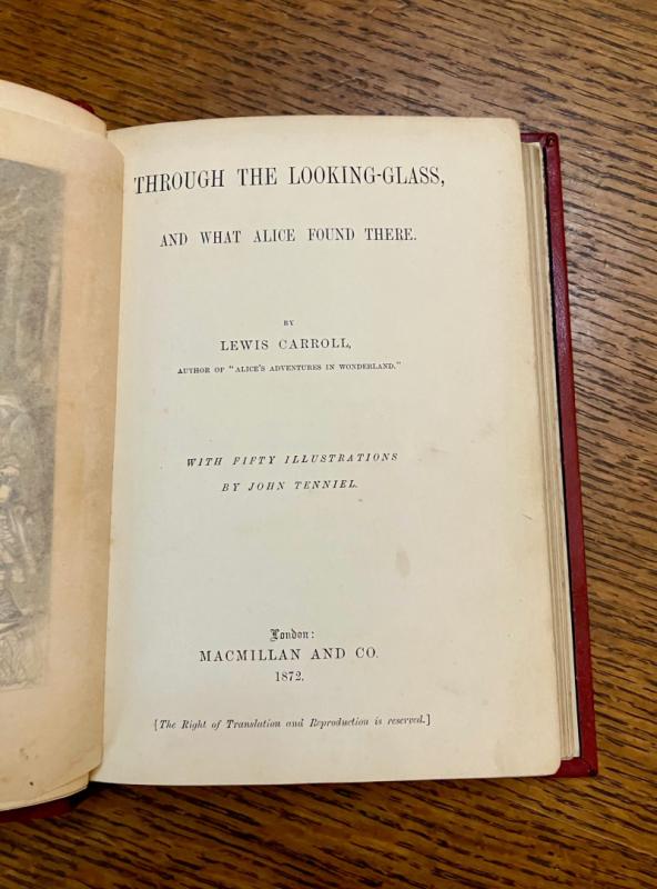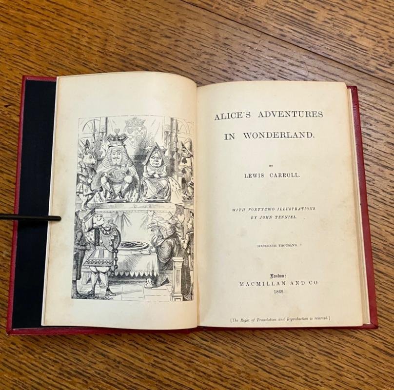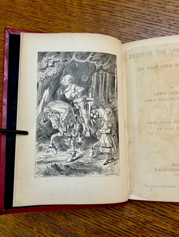 TWO VOLUMES. 8vo. (7.6 x 5.3 inches). FIRST EDITION of Through the Looking Glass, Early edition of Alice's adventures in Wonderland (Sixteenth Thousand). This is the first issue of Looking-Glass, with the misprint "wade" for "wabe" in the second line of "Jabberwocky" on page 21. ------ Both volumes Illustrated throughout with forty-two (Alice) and fifty (looking Glass) line engravings by John Tenniel. Original tissue guard over the frontis in Looking glass still present. Some of the usual marking and thumbing to some of the pages in both volumes, but not seriously, and early previous owner name, dated 1869, in Alice and a neat three line inscription, dated Christmas 1871, in Looking Glass. Overall very good copies in recent full red morocco leather bindings. Single gilt ruled borders on boards. Spines with raised bands, the compartments ruled, lettered and decorated with gilt stamps of The Mad Hatter and playing cards. All edges gilt. Black endpapers. The original publishers red cloth front and rear boards , both sets marked and darkened to areas but included for completeness, have been bound in at the rear of each volume. Cloth with gilt circular devices on boards, each with a different character from the books inside, and triple gilt ruled borders. A very good attractive pair of books, both with two previous female owners names and inscriptions dated in the relevant years of publication, to the half titles. Both volumes housed in a felt-lined, cloth covered slip case with a pull tie. An attractive set.