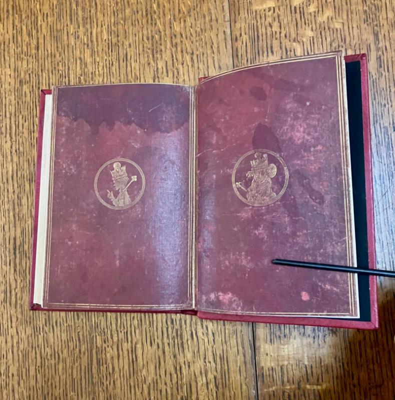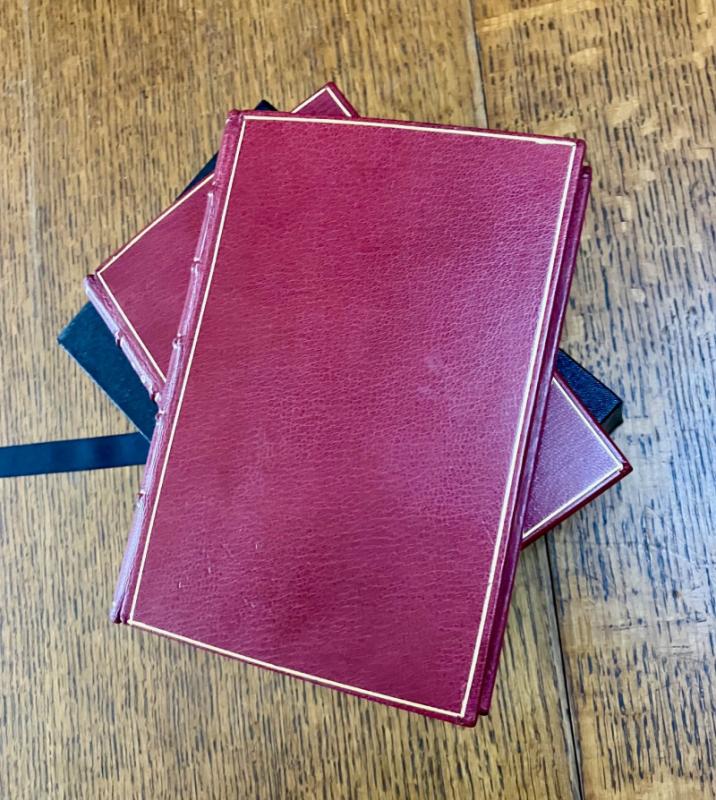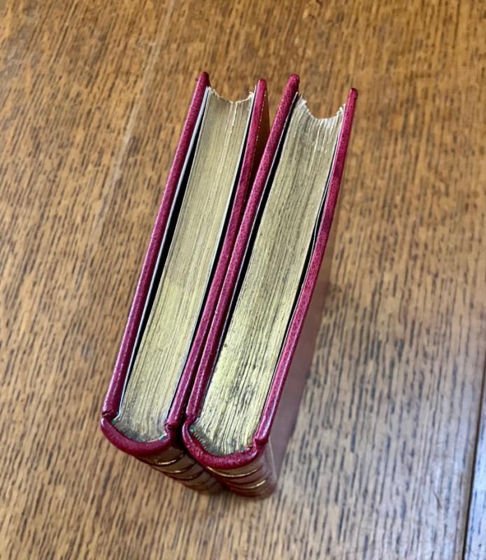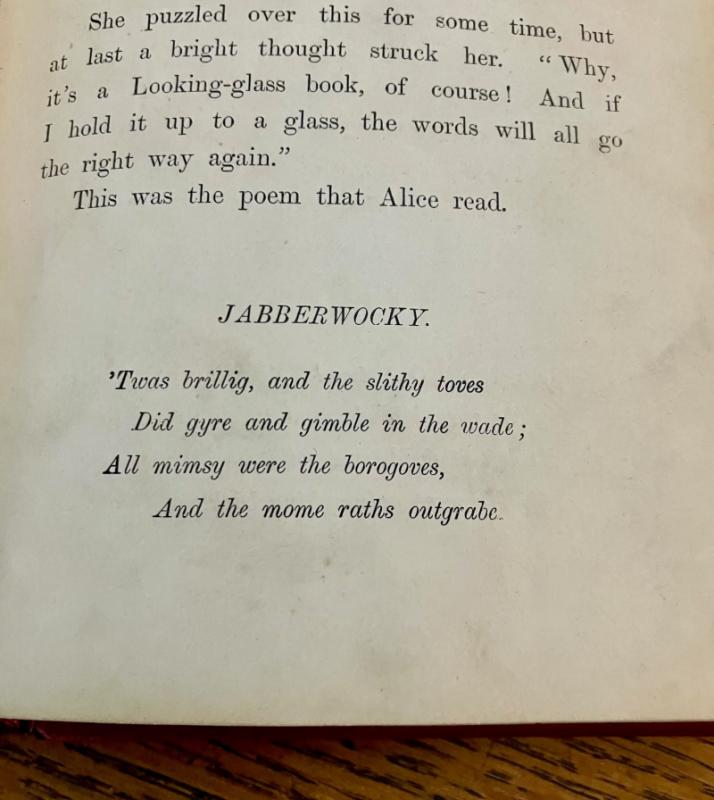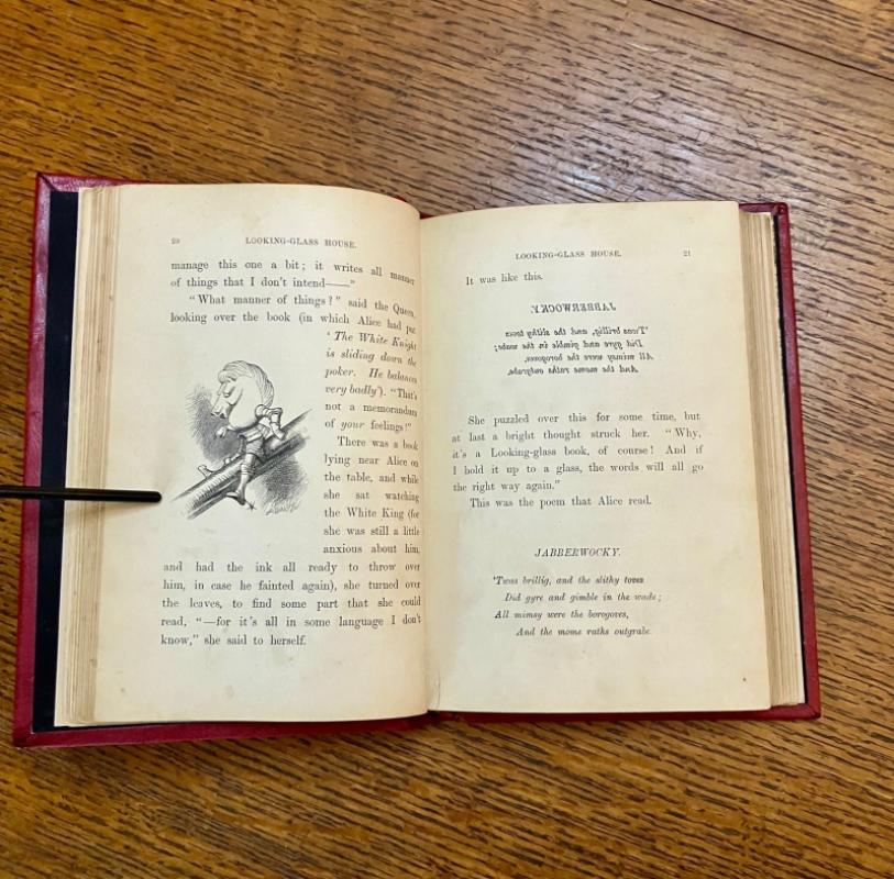 TWO VOLUMES. 8vo. (7.6 x 5.3 inches). FIRST EDITION of Through the Looking Glass, Early edition of Alice's adventures in Wonderland (Sixteenth Thousand). This is the first issue of Looking-Glass, with the misprint "wade" for "wabe" in the second line of "Jabberwocky" on page 21. ------ Both volumes Illustrated throughout with forty-two (Alice) and fifty (looking Glass) line engravings by John Tenniel. Original tissue guard over the frontis in Looking glass still present. Some of the usual marking and thumbing to some of the pages in both volumes, but not seriously, and early previous owner name, dated 1869, in Alice and a neat three line inscription, dated Christmas 1871, in Looking Glass. Overall very good copies in recent full red morocco leather bindings. Single gilt ruled borders on boards. Spines with raised bands, the compartments ruled, lettered and decorated with gilt stamps of The Mad Hatter and playing cards. All edges gilt. Black endpapers. The original publishers red cloth front and rear boards , both sets marked and darkened to areas but included for completeness, have been bound in at the rear of each volume. Cloth with gilt circular devices on boards, each with a different character from the books inside, and triple gilt ruled borders. A very good attractive pair of books, both with two previous female owners names and inscriptions dated in the relevant years of publication, to the half titles. Both volumes housed in a felt-lined, cloth covered slip case with a pull tie. An attractive set.