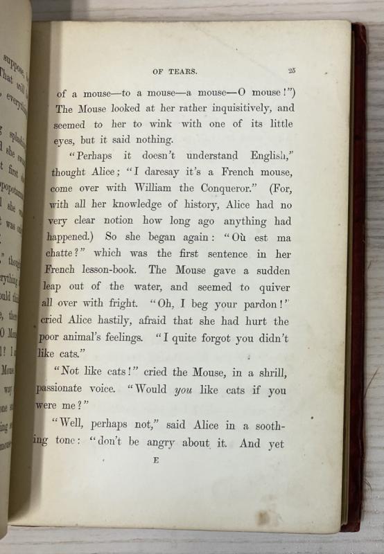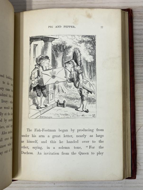 Eleventh thousand. With illustrations in monochrome by John Tenniel. Bound in the publisher's original red cloth, with gilt titles to spine and illustrations to boards; expertly rebacked with the original spine laid down and restored. The boards are a touch discoloured with some marks and stains, and the cloth is cockling on occasion, with some loss to the cloth at the corners and edges; the spine similarly, with heavy bumping and discolouration at the spine ends. The corners are rather bumped and bruised, resulting in fraying and wear. All edges gilt. Pencil ownership inscription and a few marks to the half title page. The binding is firm owing to the restoration; pages are a touch handled and with occasional marks and spotting throughout, toning towards the edges. An smart and neatly restored early edition.