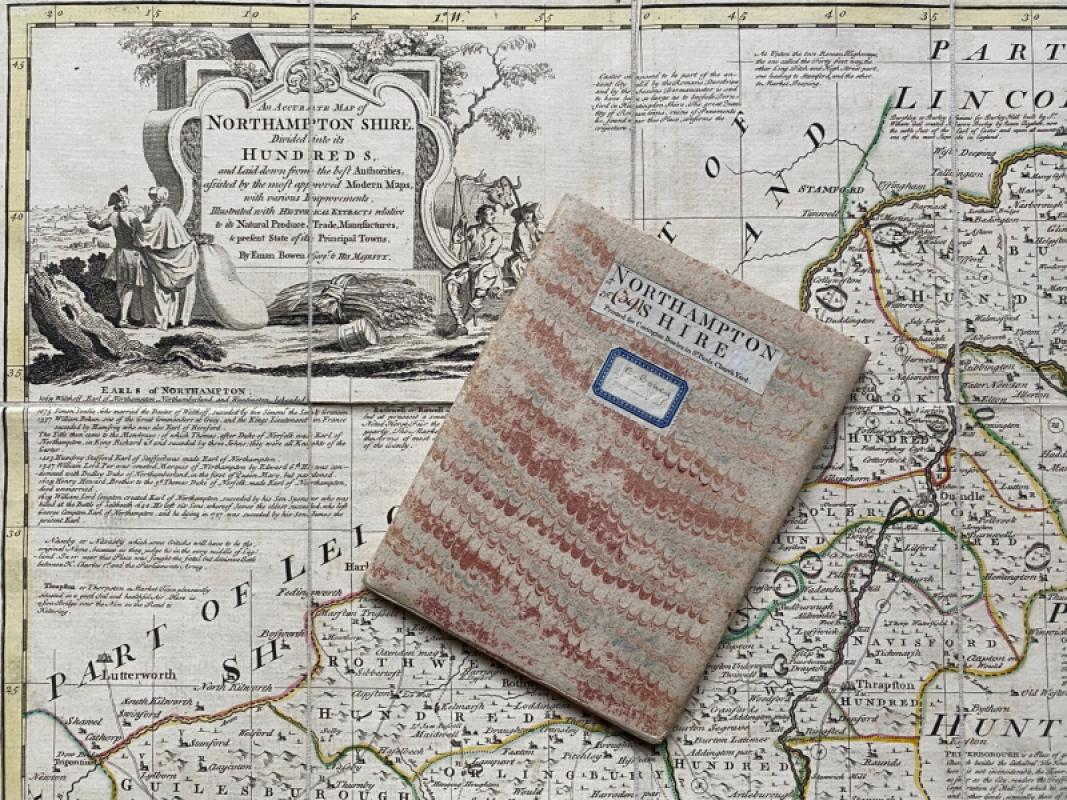 An Accurate Map of Northampton Shire Divided into its Hundreds, and laid down from the best Authorities, assisted by the most approved Modern Maps, with various Improvements, Illustrated with Historical Extracts relative to its Natural Products, Trade, Manufactures, & Present State of its Principal Towns by Emanuel Bowen, Geographer to His Majesty and printed by Carington Bowles London circa 1760. On folding linen in 16 sections, size 71 by 55 cm. Includes a decorative cartouche containing a dedication to George Montagu, Earl of Halifax etc. Contemporary hand colouring. Folds into orginal marbled slipcase. Map and case both in VG condition.