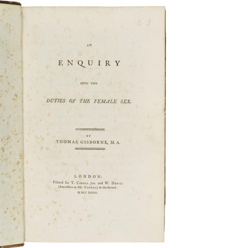 ESTC T32742. First edition. In a letter to Cassandra Austen, dated 30 August 1805, Jane Austen writes: ‘I had almost forgot to thank you for your letter. I am glad you recommended 'Gisborne' for having begun, I am pleased with it, and I had quite determined not to read it’. The ‘Gisborne’ referred to is Thomas Gisborne, and the work is most likely, as R.W. Chapman assumes, An Enquiry into the Duties of the Female Sex (1797). On the subject of female reading Gisborne says a number of things about women and fiction that either coincide with, or perhaps exerted an influence on, Austen's concept of fiction. In a chapter entitled ‘On the Employment of Time’, Gisborne recommends to ‘every woman, whether single or married, the habit of regularly allotting to improving books a portion of each day’. Significantly, Gisborne does not include novels (a term he used interchangeably with romance) among the improving works women should read. Though he readily acknowledges the popularity of novels/romances, he nevertheless laments that they obtain ‘from a considerable proportion of the female sex a reception much more favourable than is accorded to other kinds of composition more worthy of encouragement’. ref: Uphaus, R.W. Jane Austen and Female Reading. Studies in the Novel, 1987.