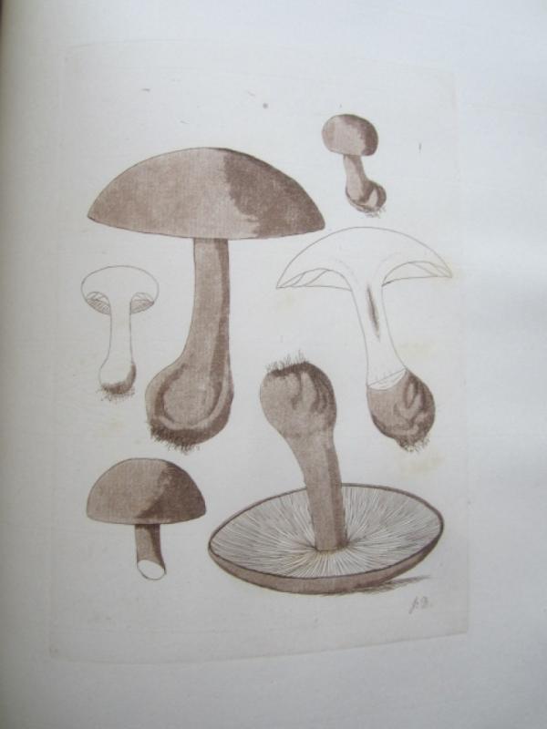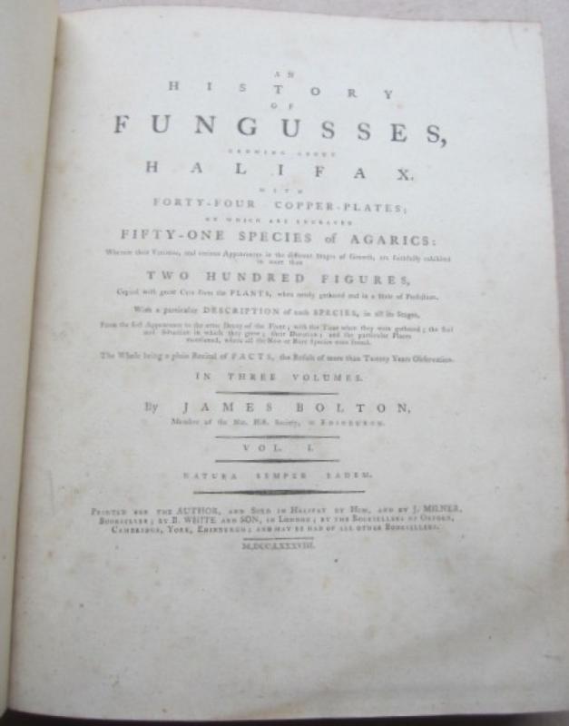 First Edition, Four Volumes (including supplement) in Two, xvi, 44, [2]; [2], xx - xxxii, [45] - 92, [2]; [2], [xxvii] - xxxii mispaginated [93] - 138, [4]; [2], xxiii - xlii, 139 - 182, [12]pp, additional engraved title, very well-illustrated with 182 engraved plates (mostly un-coloured), a few with brown aquatint or printed in bistre, hardcover, 4to, finely bound in 19th century calf, wide gilt tooled border to front and back boards, spine tooled in gilt, title labels inset on red and green morocco with gilt lettering, raised bands, inner gilt dentelles, marbled end papers, all edges marbled, some light offsetting, spotting and marginal water stains mainly to text, some light rubbing otherwise a very nice set, Provenance: with the armorial bookplate of John Rhodes and the later bookplate of the Fairfax Rhodes Library (Ref. 41907) [John Rhodes (1814 - 1898), as well as being a player of chess, he had a keen interest in natural history; his son Fairfax Junior, later Colonel, (1848 - 1928), attended Trinity College, Cambridge and obtained a Classics MA, on his death he bequeathed his large collection of books to the Cambridge Union Society, which now has a Fairfax Rhodes reading room - courtesy of The Yorkshire Chess History website), Printed For The Author and Sold in Halifax By Him ..., 1788. * James Bolton came from near Halifax in Yorkshire. He was a self-taught naturalist of humble origins, and he drew and etched all his own illustrations. "Bolton describes his specimens with great acuteness, in clear, and this, be remembered, when they were little understood." Henrey. Freeman, 371; Henrey, 465; Nissen BB1 195. (#ALD/362)