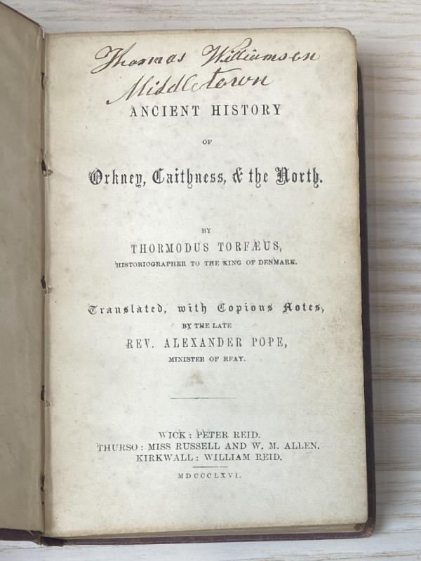 Scarce publisher's blind stamped cloth, author's name in gilt to spine, extremities rather bumped, the head and tail of the spine similarly bruised with some light loss, a few small spots and marks to the boards, rear board more noticeably, ownership stamp to verso of front blank and contemporary ownership inscription to title page. Hinges a little strained with binding visible at the introduction page and p.287 respectively, binding a touch tender throughout. Occasional light spots. Some historic folds to corners of leafs. A scarce history of northernmost Scotland in the publisher's cloth.