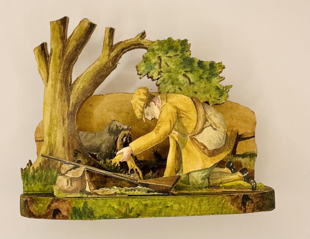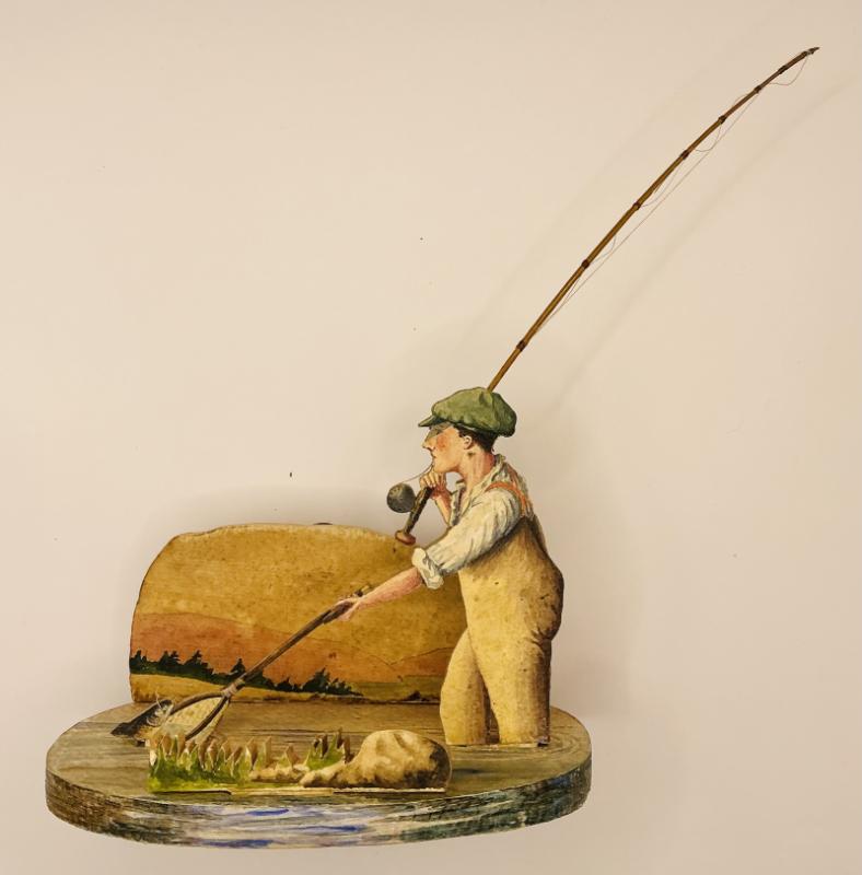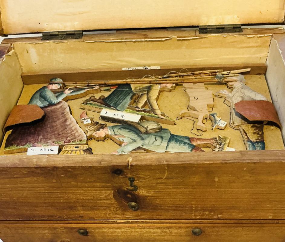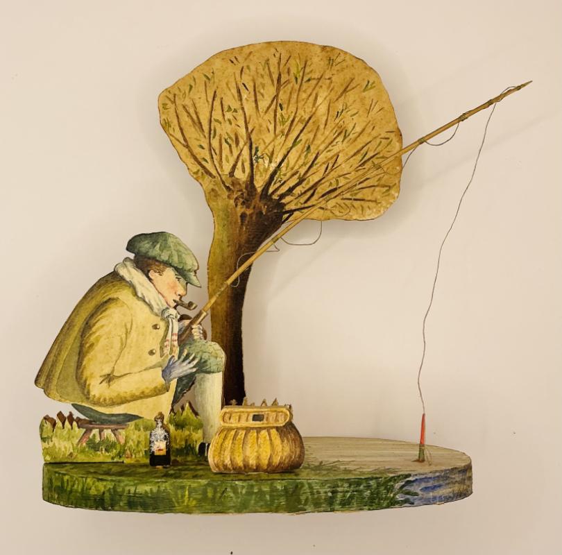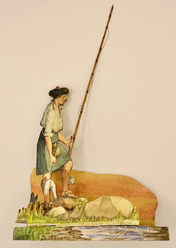 HOLMES (Arthur) A set of 12 three-dimensional country sport dioramas, "Box of Delights".12 (complete) wooden sets of hand made and painted scenes, each with a character, detachable fishing rods made of bamboo bound with twine. The pieces are individually numbered in 3 detachable trays with leather lifting straps, each with an oval base. Each scene signed in ink by the artist Arthur Holmes with compartments to slot in pieces, bases approx 163mm x 95 x 10 mm, the tallest piece 220 mm. There is some surface soiling, a couple of pieces repaired or restored, all contained in the original custom-made wooden slatted and lidded box with metal clasp, no longer functioning, a couple of stains and marks, circa 1920