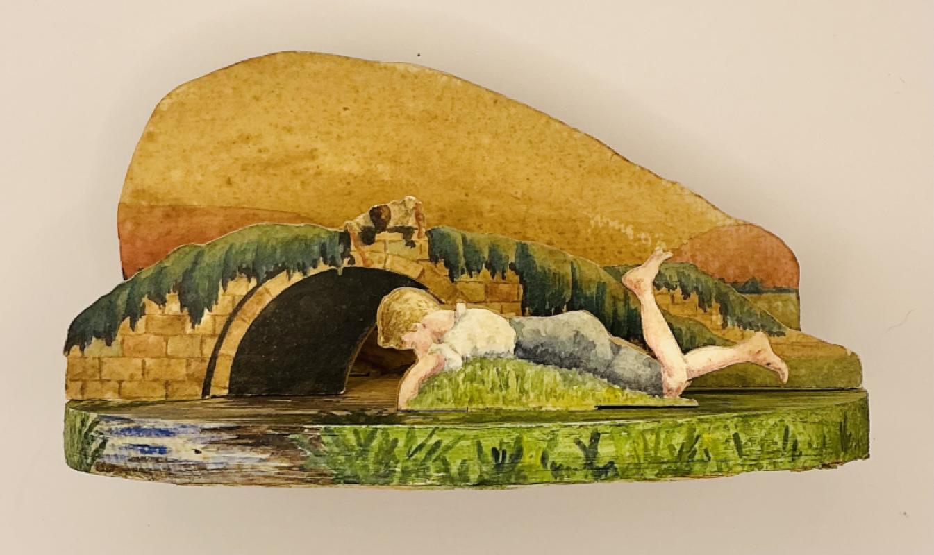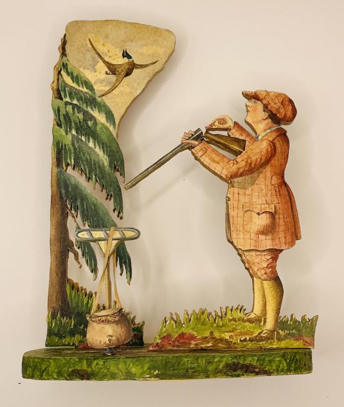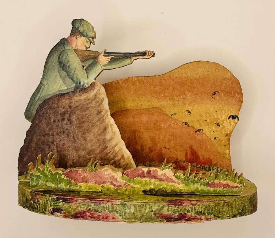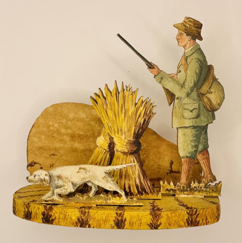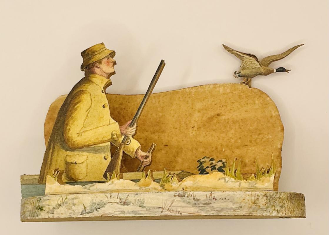 HOLMES (Arthur) A set of 12 three-dimensional country sport dioramas, "Box of Delights".12 (complete) wooden sets of hand made and painted scenes, each with a character, detachable fishing rods made of bamboo bound with twine. The pieces are individually numbered in 3 detachable trays with leather lifting straps, each with an oval base. Each scene signed in ink by the artist Arthur Holmes with compartments to slot in pieces, bases approx 163mm x 95 x 10 mm, the tallest piece 220 mm. There is some surface soiling, a couple of pieces repaired or restored, all contained in the original custom-made wooden slatted and lidded box with metal clasp, no longer functioning, a couple of stains and marks, circa 1920