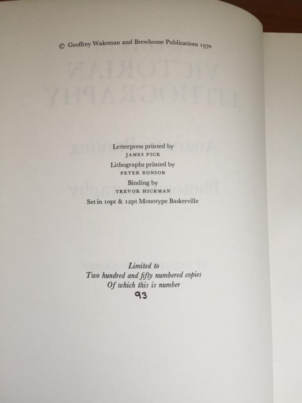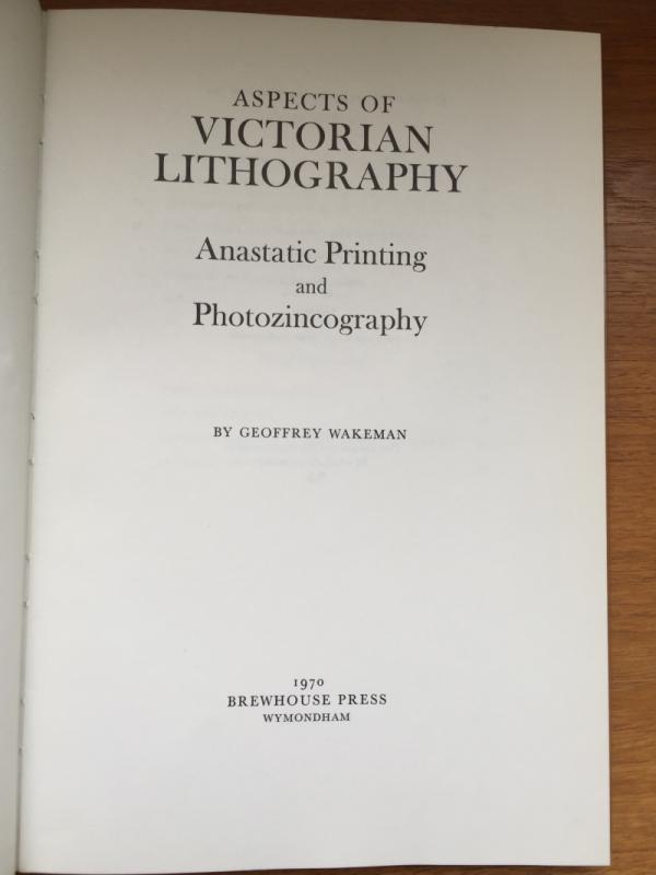 ‘Aspects of Victorian Lithography Anastatic Printing and Photozincography’ ~ by Geoffrey Wakeman; pub by Brewhouse Press 1970; no 93 of limited edition of 250 copies; quarter bound in leather with decorative marbled boards with gilt design; also title in gilt on spine, plastic dust jacket; 8 x c12 , 64pps incl 3 tipped in plates; slight bit of foxing on top edge o/w excellent condition.. Was £95 - Now £75