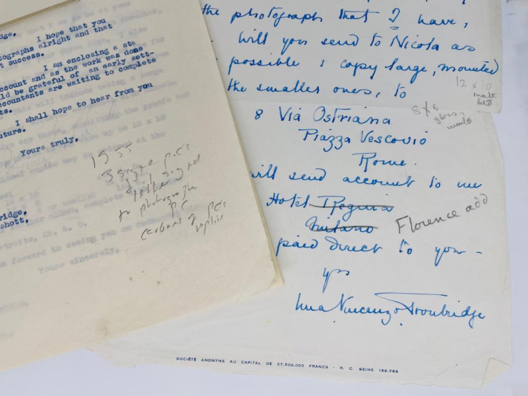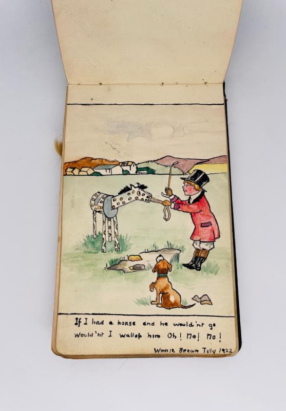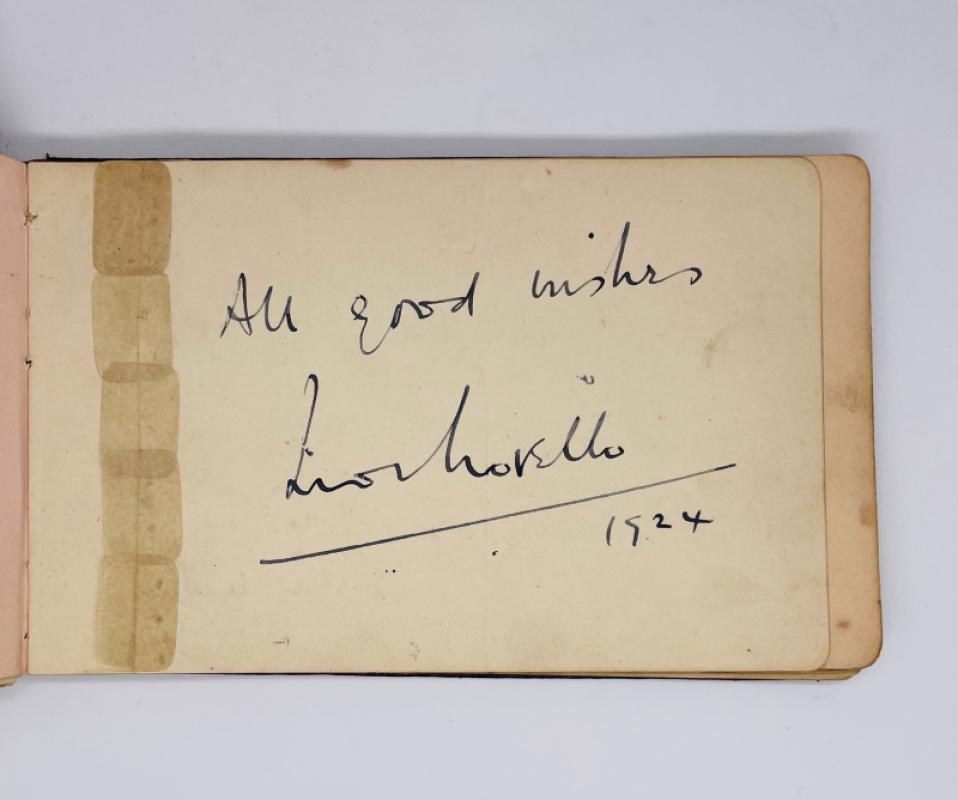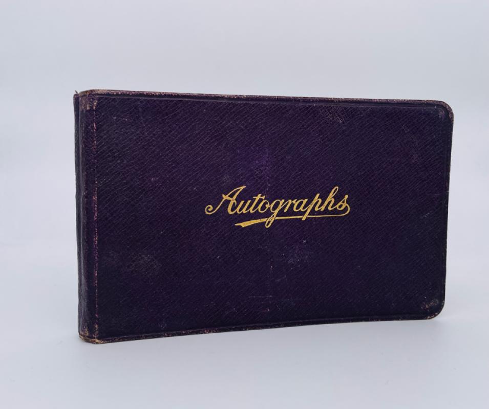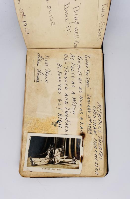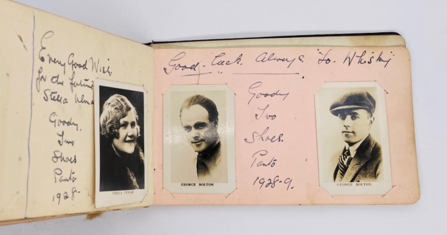 A wonderful friendship-cum-autograph album and unique item of interwar theatrical memorabilia (1922-1949), featuring signatures by British stage actors and music hall performers, as well as inscriptions by mostly forgotten pantomime ensemble performers (esp. 1927-30), collected by Hilda Oglesby (“Whisk(e)y” in Goldilocks and Goody Two Shoes): brim-full of signatures (most notably, Ivor Novello (perhaps collected at a performance of his successful 1924 play, The Rat?), the “specialist in melodrama” Wilfred Shine, comedian Harry Weldon, male impersonator Ella Shields, best known for ‘Burlington Bertie from Bow,’ (see left-hand illustration to title page) and Shakespearean actor Godfrey Tearle (1928)), as well as affectionate, witty and pithy inscriptions and promotional photographs from Oglesby’s fellow pantomime performers (including a lock of (faux) golden hair!). Promotional photographs include Ella Shields, the Louise Sisters, posing as toys with one in a Golliwog costume, plus earlier entries, including colour pencil and pen drawings by her family and friends (c.1922).