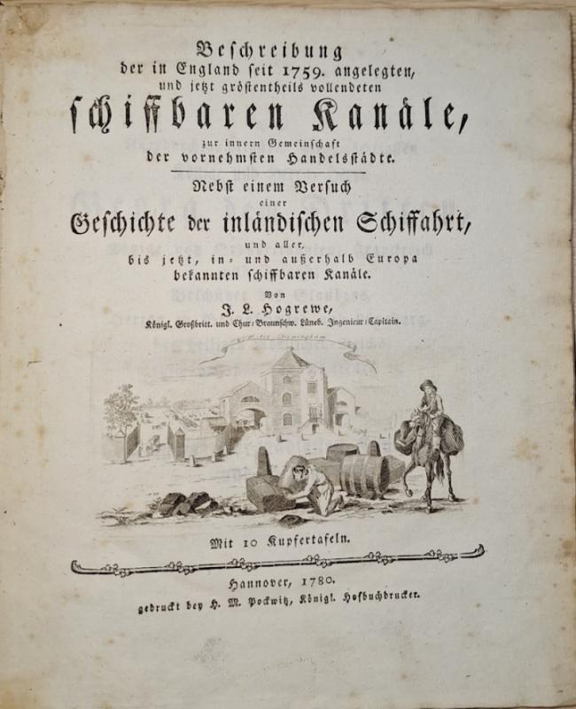 A substantial and early German-language study of Britain’s rapidly developing canal network, produced at the height of the Canal Age. Johann Ludwig Hogrewe (1737-1814) was a highly regarded Hanoverian military engineer who served in the Hanoverian Engineer Corps. Commissioned by the British Hanoverian King George III, he was tasked with surveying and documenting England's canal system. Hogrewe provides one of the first systematic continental surveys of English canal construction following the pioneering 1759 Bridgewater Canal, describing the engineering, routes, commercial purpose, and economic effects of the major waterways then completed or underway.