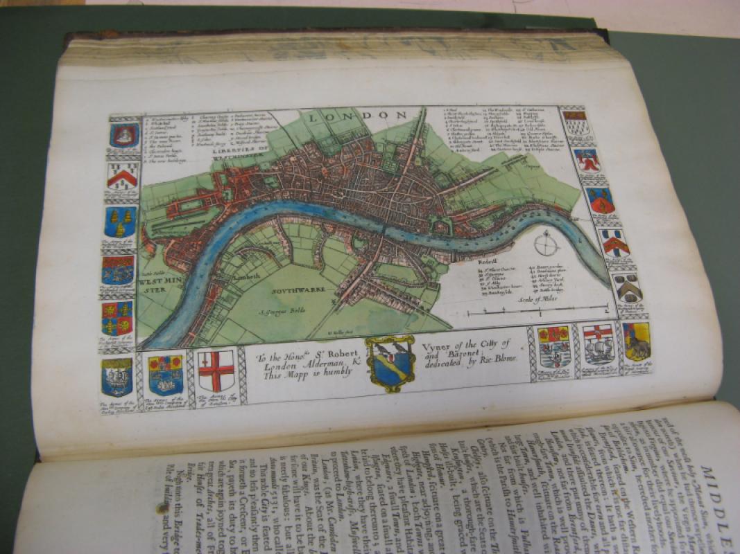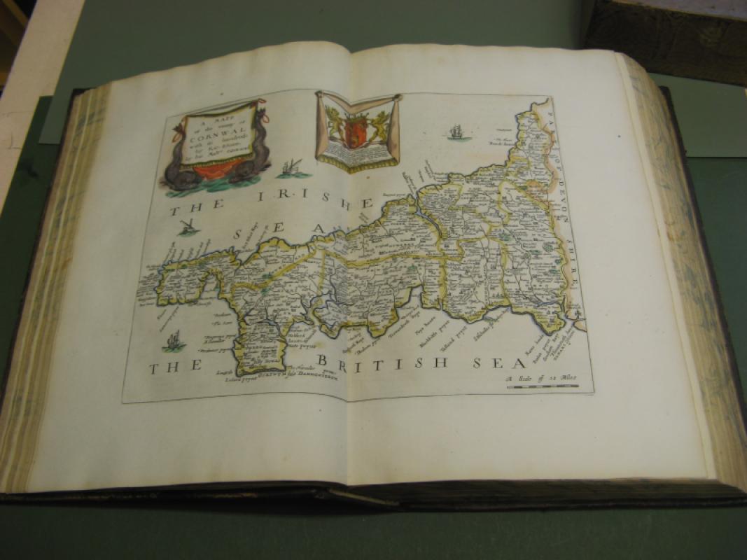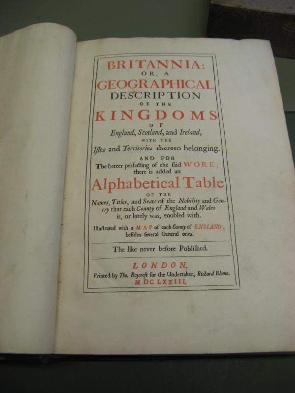 The Richard Blome Britannia County Atlas C1673 is a rare and collectible book containing 48 hand-coloured maps. Bound in leather, this vintage atlas offers a fascinating insight into the geography and history of Britain in the 17th century. Perfect for antique book collectors, historians, and enthusiasts of cartography, this beautifully crafted volume is a valuable addition to any collection.Blome (Richard). Britannia: or a Geographical Description of the Kingdoms of England, Scotland and Ireland with the Isles and Territories thereto belonging....., Illustrated with a Map of each County of England besides Several General Ones. The like never before published, 1st edition, Thomas Roycroft for the Undertaker, Richard Blome, 1673, title page printed in red & black, dedication to Charles II, preface and list of subscribers, twelve engraved sheets of heraldic crests (printed back-to-back) with 812 engraved coats of arms, all with contemporary hand-colouring, folding map of the British Isles minor repairs to folds , forty-eight double-page engraved maps including four folding (North Wales, South Wales minor repair to folds , Scotland and Ireland) and one single page map of London (complete as list), all maps with bright contemporary outline hand colouring, fully leather bound housed in custom made slipcase