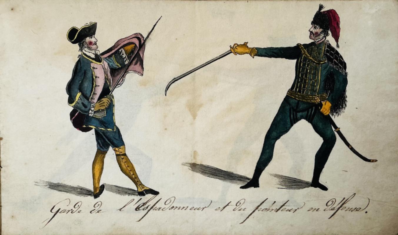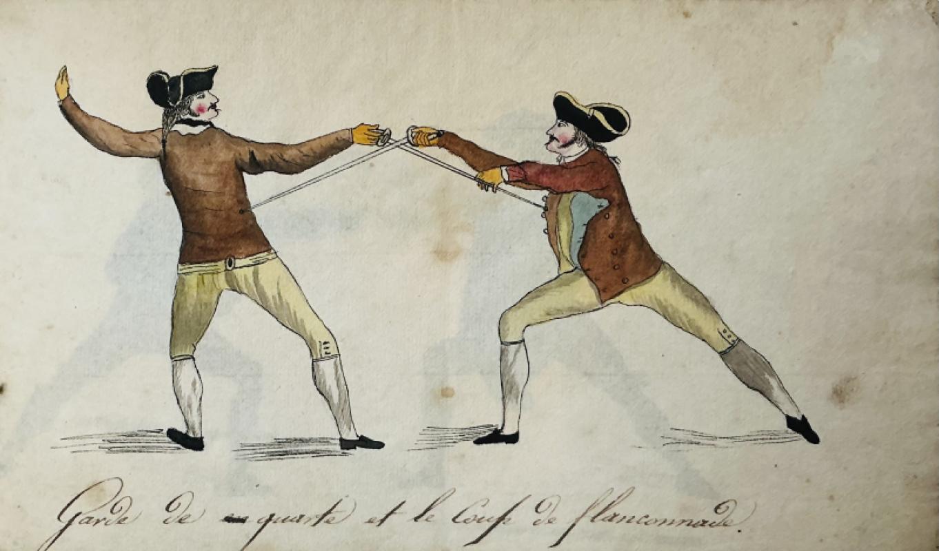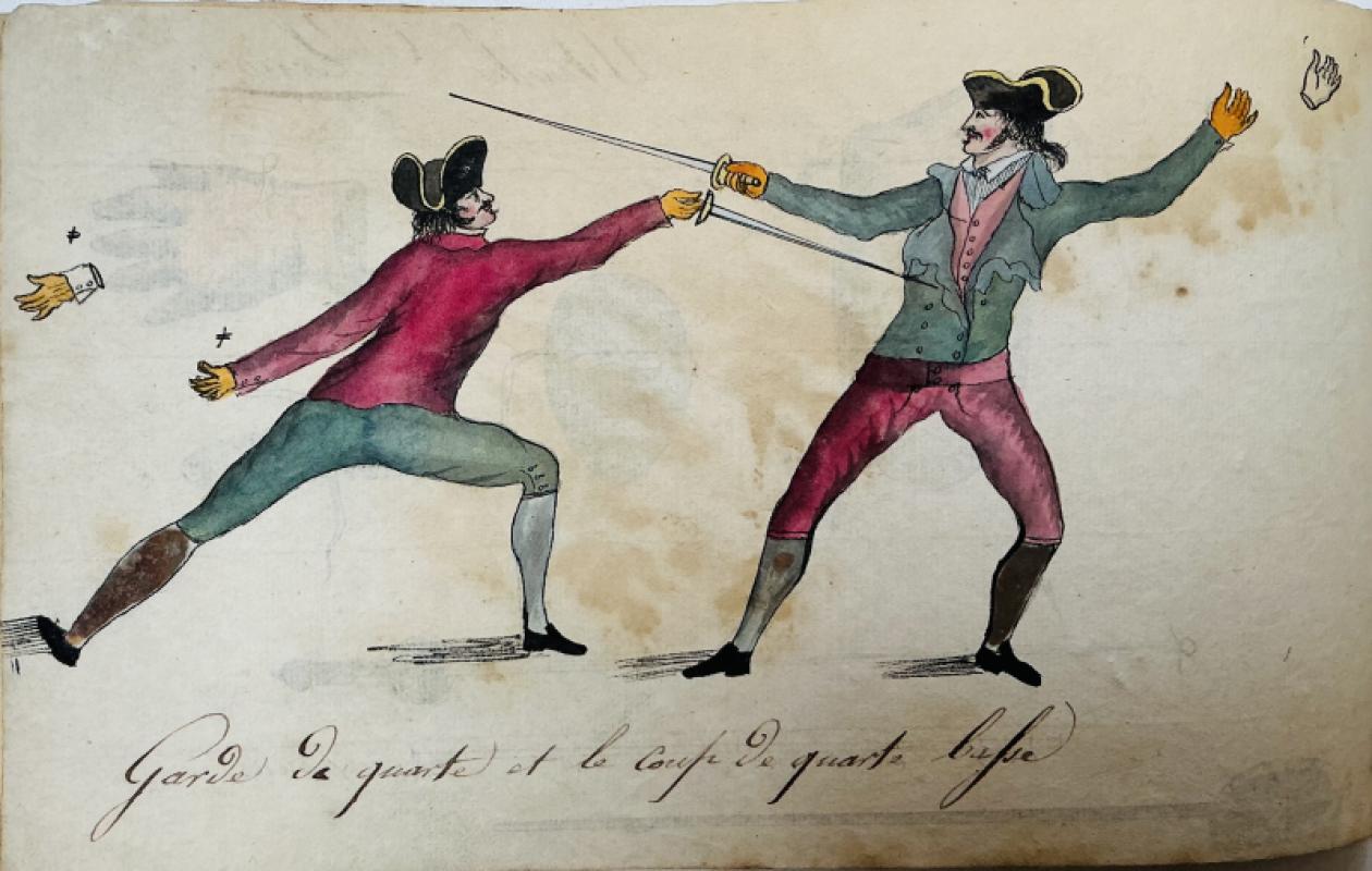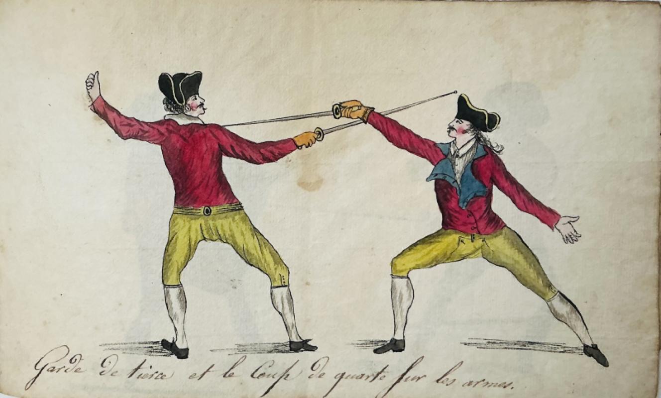 [ANON] MANUSCRIPT. A late 18th century booklet with eight pen and ink and colour drawings of sword fighting with rapiers, a sabre, lanterns and cloaks, each titled in French, seven with figures of fencers and one with equipment, each page approx. 19.5cm x 11.5cm. In the original paper wraps, covered with pen trials but with the title “Cahier d’Armes’ still decipherable. Original sewing still in place. The paper is thin, so there is some colour bleed through. The images appear to be copied from “The School of Fencing”, 1763 by Domenico Angelo. The plates were originally designed and engraved by John Gwyn. A few corners are turned, but generally in good original condition. No date but the style late c18th we think.