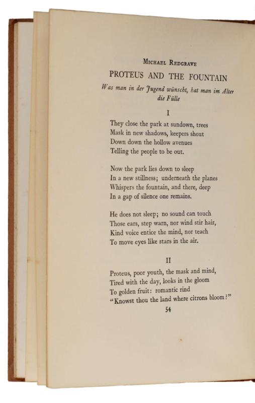 First edition, one of 500 surviving copies, signed by Michael Redgrave on the upper pastedown. J.H. Willis has suggested that it ‘must have been one of Leonard Woolf’s aims to use the Living Poets series to correct a serious imbalance in favor of Oxford’s undergraduates. Blackwell had for years published an annual anthology of Oxford undergraduate verse, but no established publisher had espoused the Cambridge poets. In addition to all of their older Cambridge associations, Leonard and Virginia had more recent connections through Dadie Rylands and Julian Bell, Virginia’s nephew. An annual anthology of Cambridge undergraduate poetry was congenial to the Woolfs, although it only lasted two years. But these were the years of a remarkably talented group of students’ (Leonard and Virginia Woolf as Publishers: The Hogarth Press 1917-1941 (Charlottesville, VA, 1992), p. 152). The first of these anthologies was Cambridge Poetry 1929, followed by the present volume in 1930 – the thirteenth title to be issued in the ‘Hogarth Living Poets’ series edited by Dorothy Wellesley, which ‘differ[ed] from the other series [of the Hogarth Press] in that they are collections of original poems rather than essays or discussions’ (Woolmer, The Hogarth Press, p. xxxii). ¶¶
