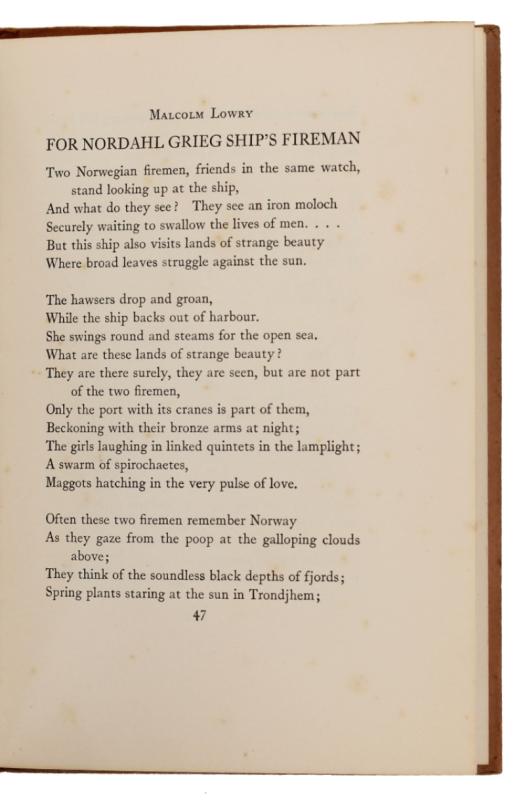 Apart from the three editors and Julian Bell, the other contributors to Cambridge Poetry 1930 were Lionel Birch, Jacob Bronowski, J.D. Cullen, John Davenport (who had co-edited Cambridge Poetry 1929), Robin Fedden, Louis Le Breton, John Lehmann, Malcolm Lowry, K.A. Matthews, G.F. Noxon, J.M. Reeves, A.J. Rose, and Arthur Tillotson. Of these, Bell, Bronowski, Cullen, Davenport, Fedden, Lehmann, Matthews, Redgrave, Reeves, Sykes, and Tillotson had all contributed to Cambridge Poetry 1929, but this second anthology also attracted five new writers: Birch, Le Breton, Lowry, Noxon, and Rose. Malcolm Lowry’s contribution was the poem ‘For Nordahl Grieg Ship’s Fireman’ (pp. 47-49), which was the first appearance of any of his writings in book form. ¶¶