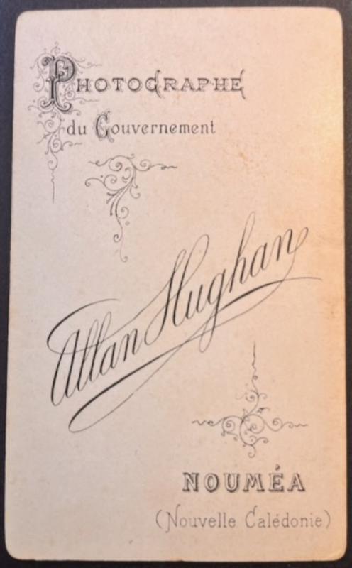 Allan Hughan was a British merchant and ship's captain who had been shipwrecked in New Caledonia in 1870. By 1871 he had started a commercial photography business in Nouméa, and the following year he was appointed government photographer. In addition to studio portraits his work included views ofNouméa and the interior of the island, documentation of the traditional way of life and customs of the Kanak people, and an official photographic study of the French penal colony on the Isle of Pines.
