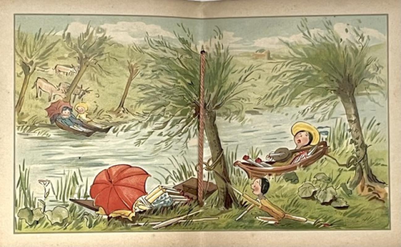Small square 8vo.; publisher’s pictorial card covers printed in chromolithography with wrap-around design, silk cord ties with red tassels; pp. [28]; with letterpress title-page and calendar pages throughout in red and grey, in calligraphic font; with 13 colour-printed plates,including a centre-spread of a boating party on the river; an uncommonly good copy with some external soiling, ties intact with tassels, internally crisp and bright with the usual toning but no marking or ownership marks; a very scarce Ainslie title explained by the ephemeral nature of an annual calendar.