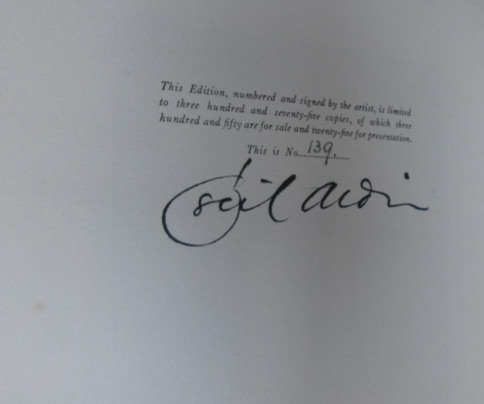 Hardback. Signed, limited edition of this beautiful book. Limited Edition No 139 of 375 copies signed by the artist. Colour frontis and 15 further plates, printed separately and tipped in, with captioned tissue guards. 16 black and white plates plus further within text black and white drawings throughout. Colour illustrated endapers. Quarter bound in vellum ruled in gilt to edges and with gilt lettering to the papers to the boards. Top edge gilt. A little rubbed to corners. Slightly tanned and slightly finger marked externally. Very occasional foxing within. Plates all present. A lovely book.