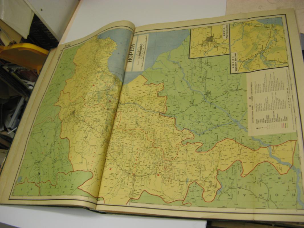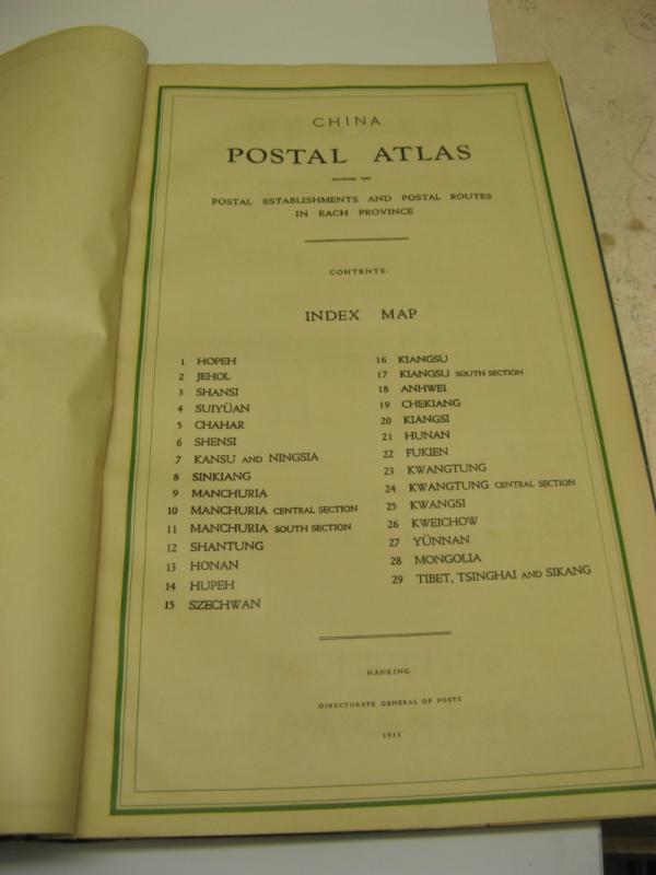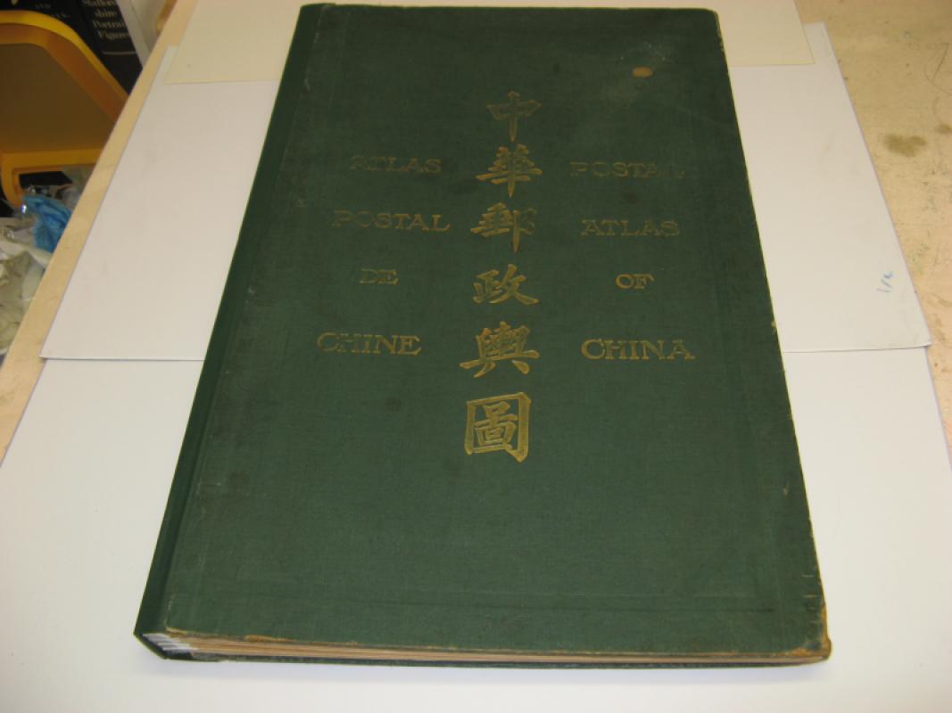 Nanking, Directorate General Posts, 1933. Large folio (62 x 38 cm.). Third edition (2nd edition 1919). "The present issue has been corrected up to various dates in 1933. For the first time, the Postal atlas shows telegraph offices, air-mail lines and motor-vehicle routes" (from Preface). Original green cloth with title lettering in gilt on upper cover.