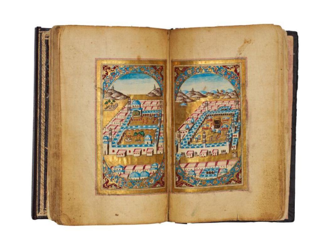 Particularly notable are the double-page representations of Mecca and Medina: the Ka‘ba clearly depicted at the centre of the sanctuary within the Masjid al-Haram, rendered in a stylised bird’s-eye view with enclosing arcades and minarets, paired with a corresponding view of the Prophet’s Mosque.