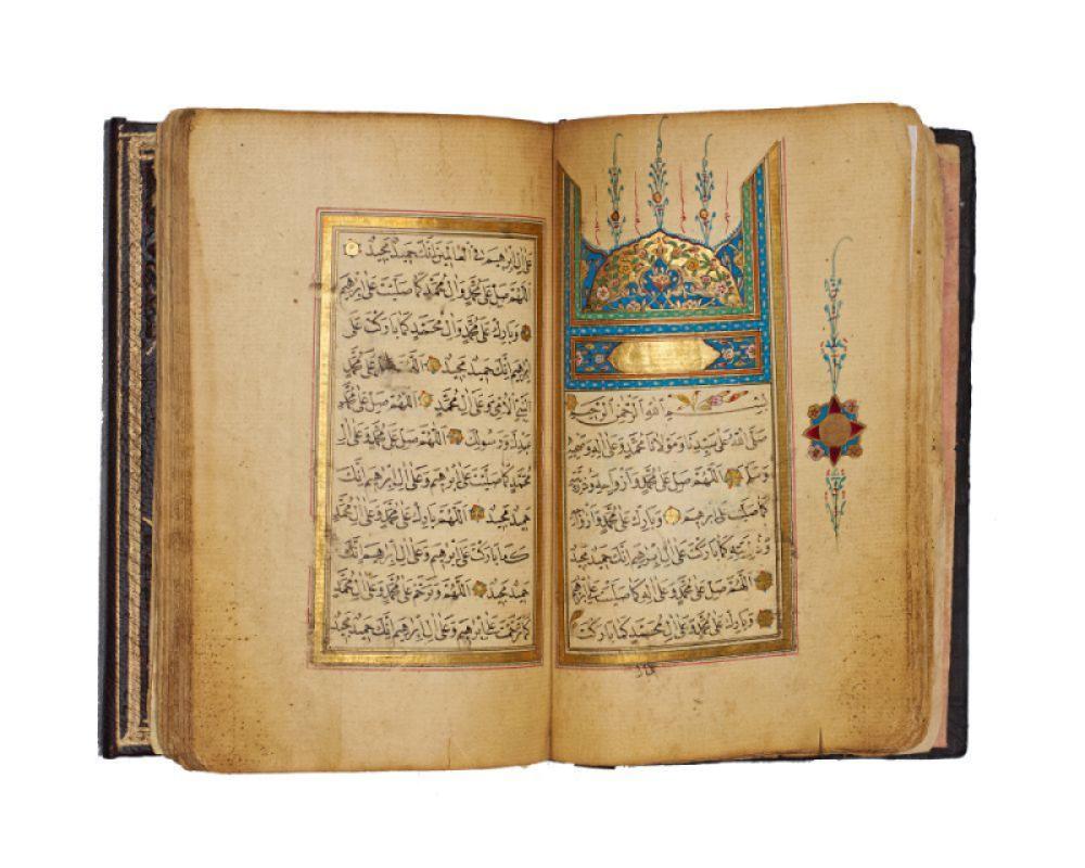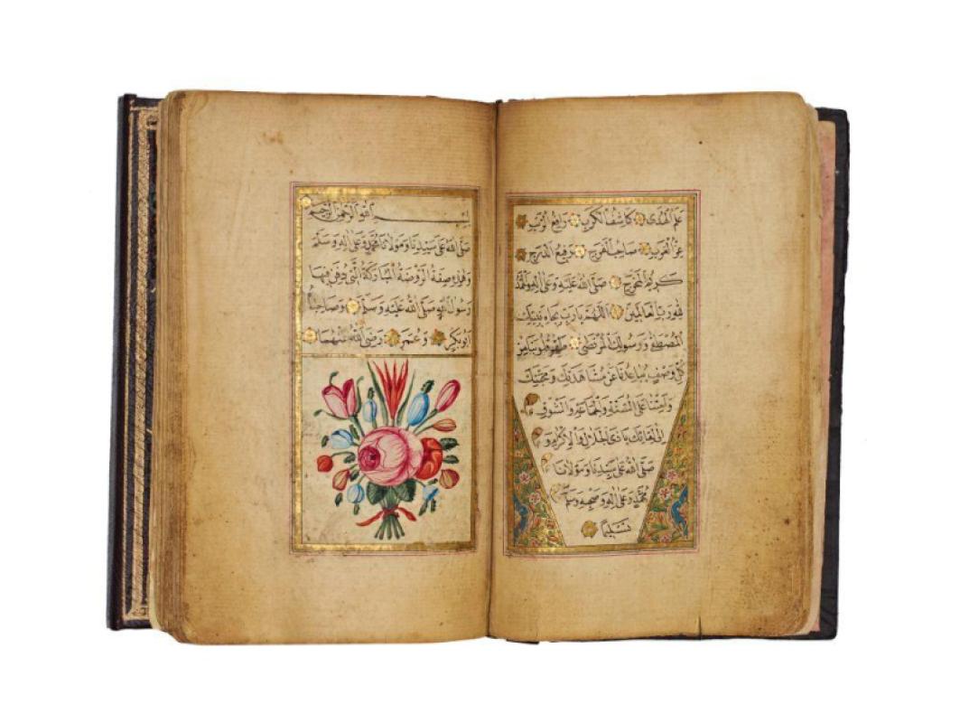 This example was produced as a portable personal prayer book, written in a neat Arabic hand and framed throughout in gold and colour. The manuscript is richly ornamented with illuminated headpieces, floral bouquet pages, and sectional devices that articulate the rhythm of the text.