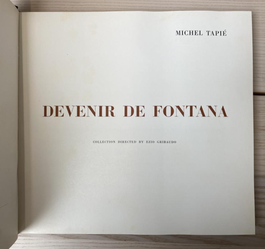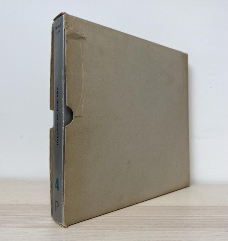 Collection directed by Ezio Gribaudo. Illustrated with colour lithographs. Text in English Publisher's black cloth in silver dust wrapper, cutout slash to front cover (tiny nick to upper point). Light bumps to extremities, hinges & corners of head and tail of the spine, dust wrapper appear rather well handled with some handling marks and creases. Housed in card slipcase, age toned and with some wear including a large closed tear & crease to front rear panel. A scarce bound example of Lucio Fontana's abstract lithographs; Fontana founded the artistic movement Spatialism.