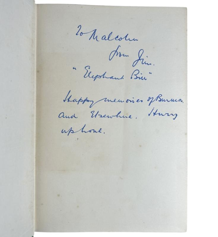 London: Rupert Hart-Davis, 1950. First edition, first printing. This is a very good copy. The John Minton dust jacket has some small closed tears, sunning at the spine, and some tape reinforcement to the top and tail of the spine. It has not been price clipped (18s. net). The green clothbound boards are notably clean, with some usual bumping from shelf wear. The text blocks are slightly toned, and the side edge a trifle foxed. This copy is inscribed by the author to Malcolm Freshney to the front fly: ‘To Malcolm | from Jim. | “Elephant Bill” | Happy memories of Burma, and elsewhere. Hurry | up home”. Wonderful inscription between two prominent figures of the Burma campaign. Overall, this is a very good copy of a fine signed title.