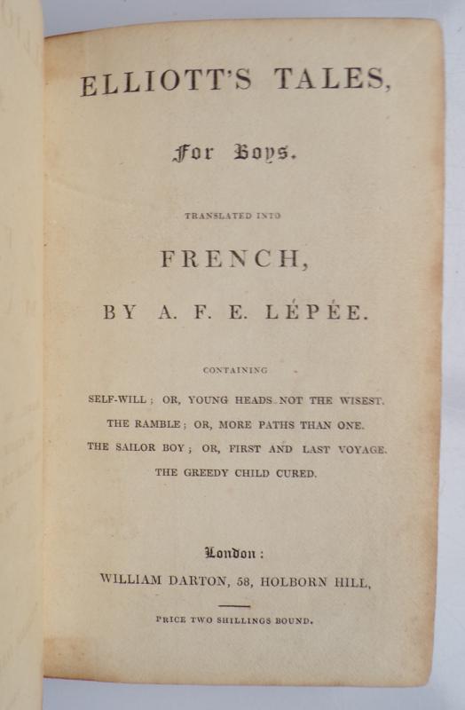 This is a nice Children’s book by William Darton containing four stories by Marie Elliott translated into French, bound in an old quarter leather binding, just under 6 inches tall, each story is illustrated with a folding frontispiece, and a few full page illustrations.