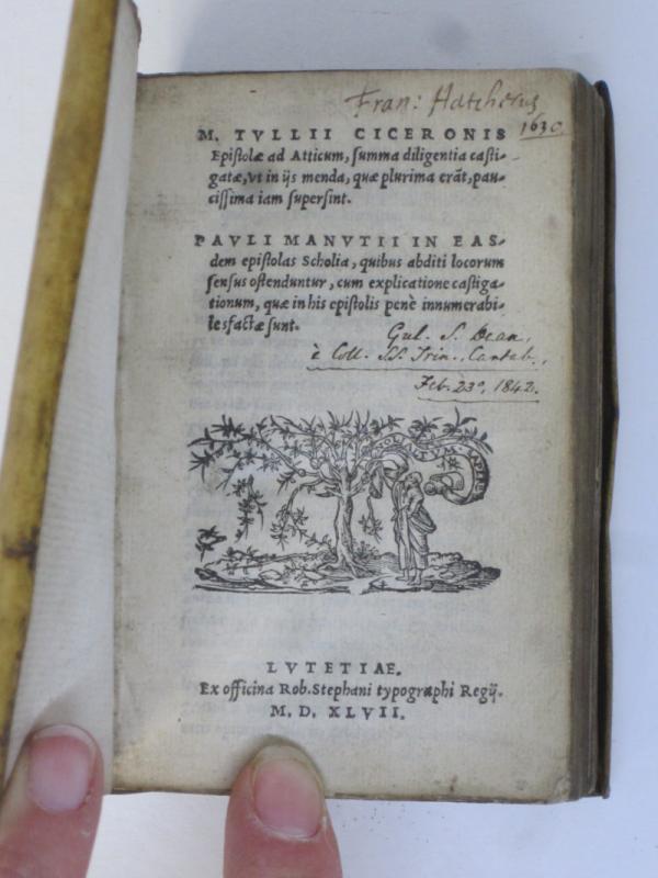 Additional Provenance: from the information on the title page, we can conclude that the owner was William S. Dean, who attended Trinity College in the University of Cambridge in 1842. This can be none other than William Smith Dean, who was admitted as a sizar to Trinity College, matriculating in Michaelmas 1839. His tutor was a “Mr Perry,” but little else appears to be known of him. At the top margin of the titlepage, there is the early ownership inscription “Fran: Hatcherus / 1630”, which almost certainly stands for Franciscus Hatcherus, a Latinization of the English name Francis Hatcher. This is likely the early seventeenth-century lawyer Francis Hatcher of Sutterton, Lincolnshire, who was a member of Gray’s Inn, one of the Inns of Court in London. He was godson to the famous jurist and philosopher Francis Bacon, 1st Viscount St Alban (1561-1626). Bacon left him one hundred pounds in his will. (CLASSICS/140)